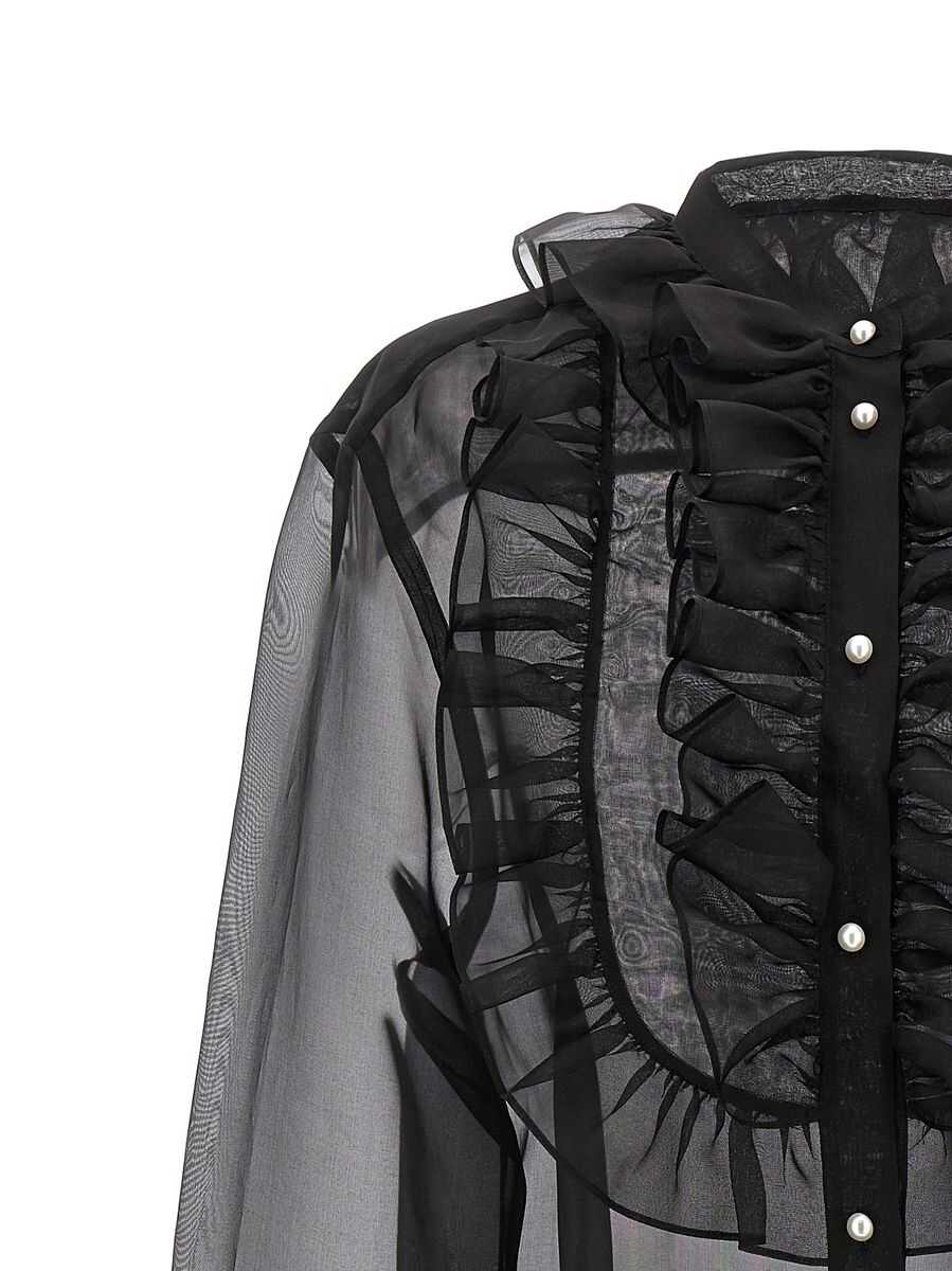 Silk organza shirt with plastron and ruffles, button closure, long sleeves