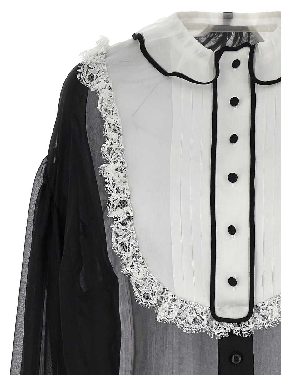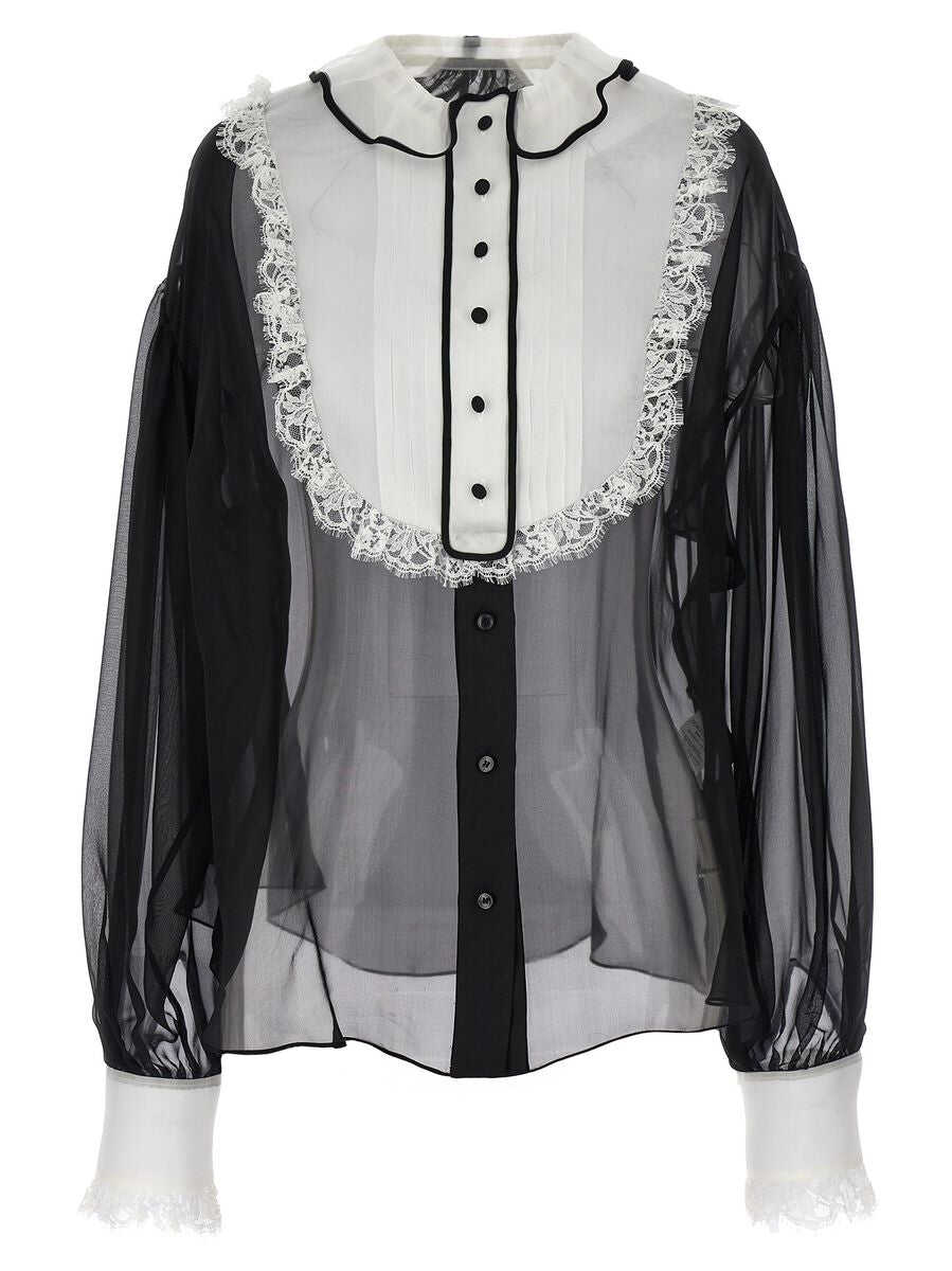 Silk chiffon shirt with contrast organza plastron and cuffs, button closure, long cuffed sleeves