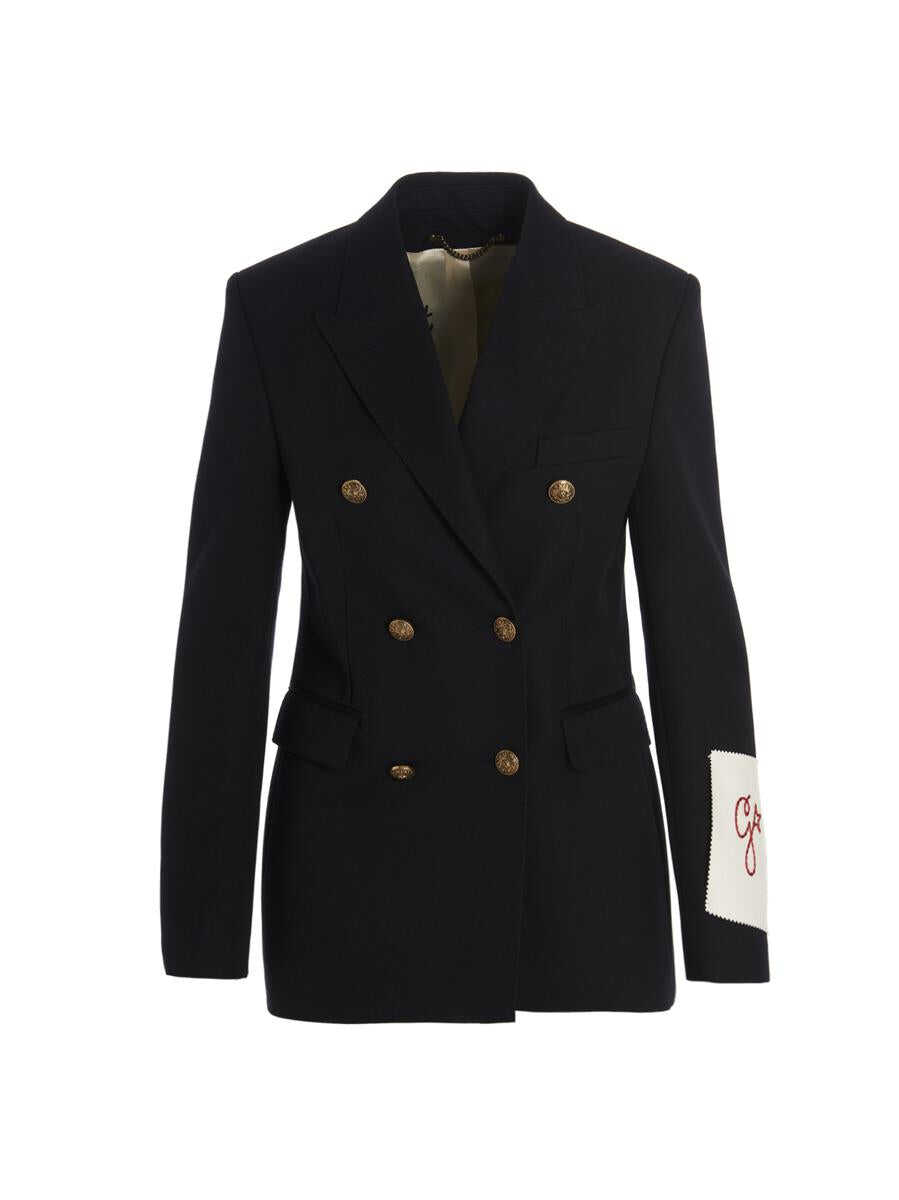 ‘Diva’ blazer in virgin wool blend, double-breasted style with front metal button closure, peak lapels, breast pocket, flap pockets, structured shoulder pads, long sleeves with embroidered logo patch, back slits, viscose and cupro monogram blend lining