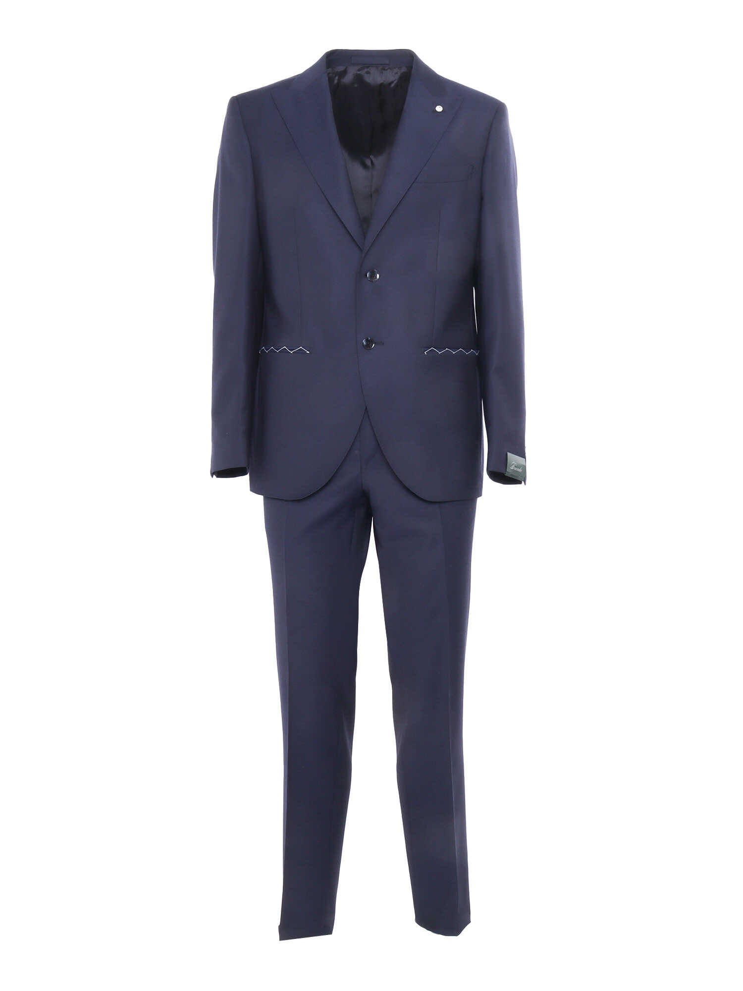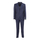 Stretch wool suit, single-breasted jacket, logo brooch, slit pockets, chest pocket, back vent, tailored pants, ironed crease, belt loops
