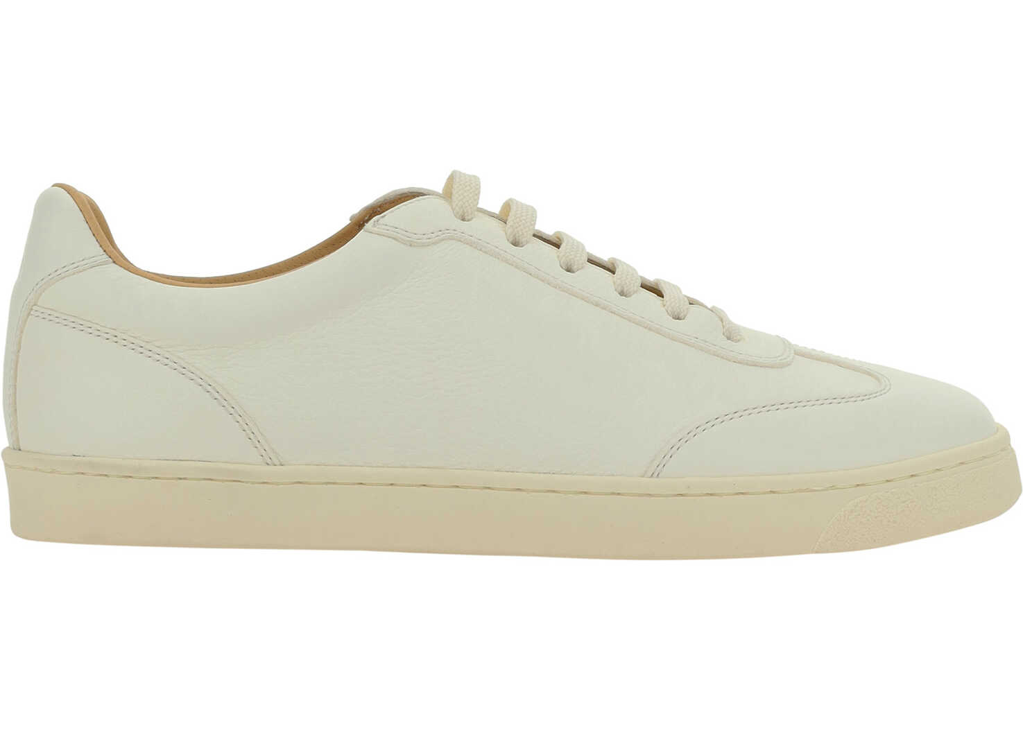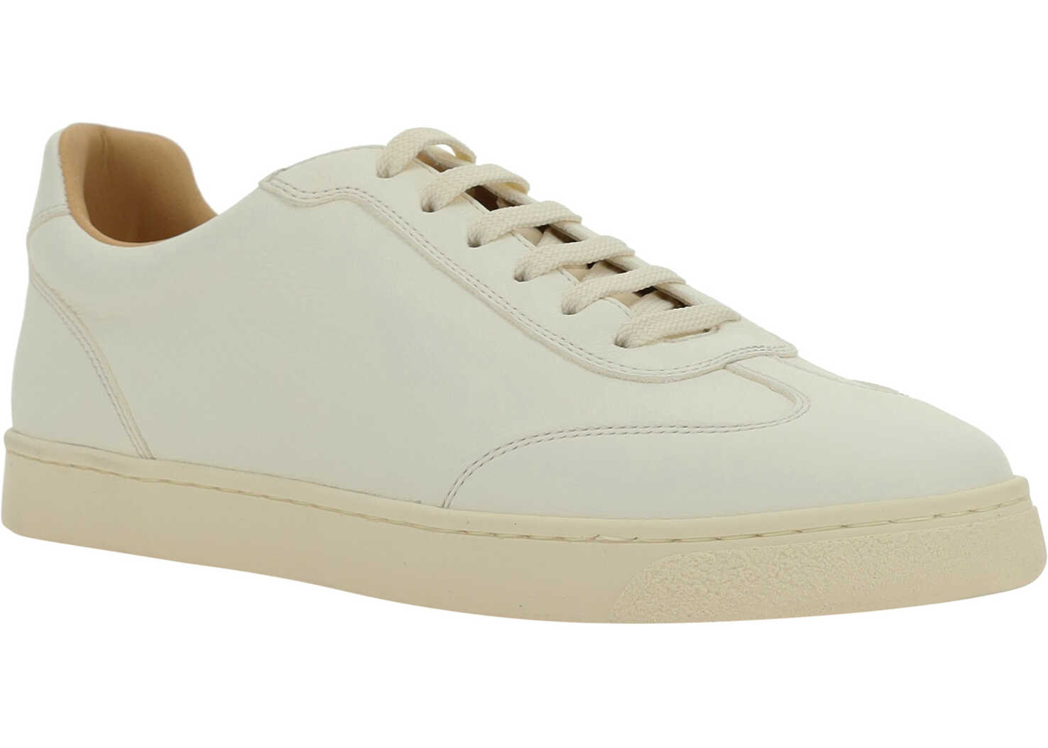 Calfskin Sneakers by Brunello Cucinelli, featuring an elongated toe, a lace-up front fastening, a contrasting flat sole, a press-studded logo insole, and a press-studded logo back label.
