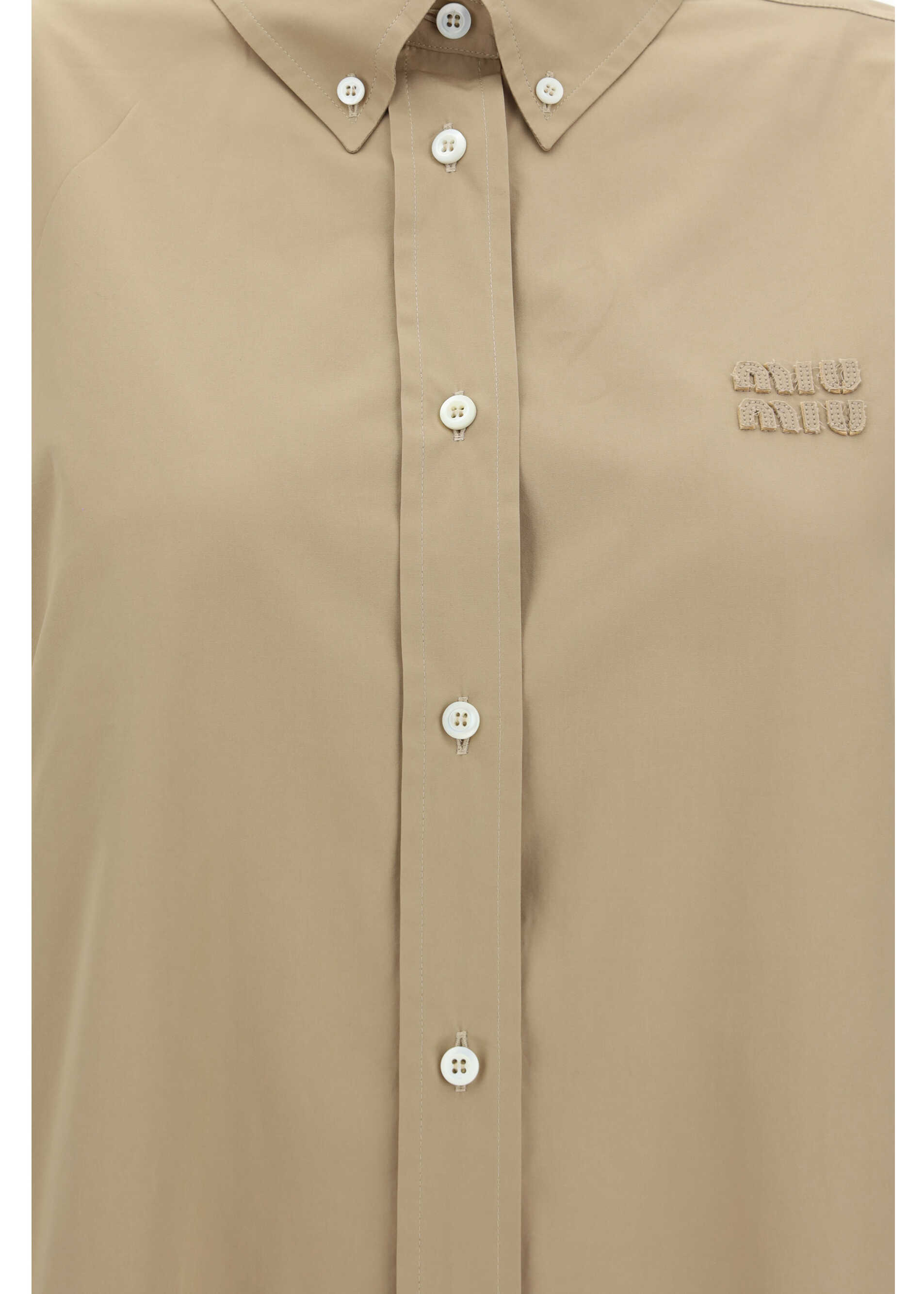 Cotton Shirt by Miu Miu, featuring classic collar, front placket, iconic embroidered monogram on front, button-adjustable cuffs, monochrome pattern, regular fit.