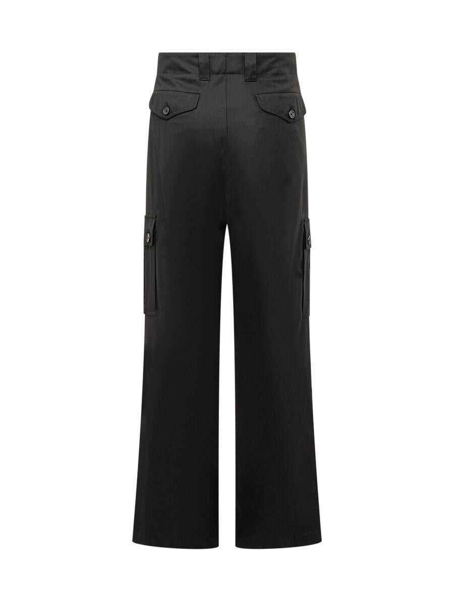 Virgin wool cargo pants. Button and zipper closure. Belt loops. Four pockets on front. Two flap and button pockets on back. Two side cargo pockets.