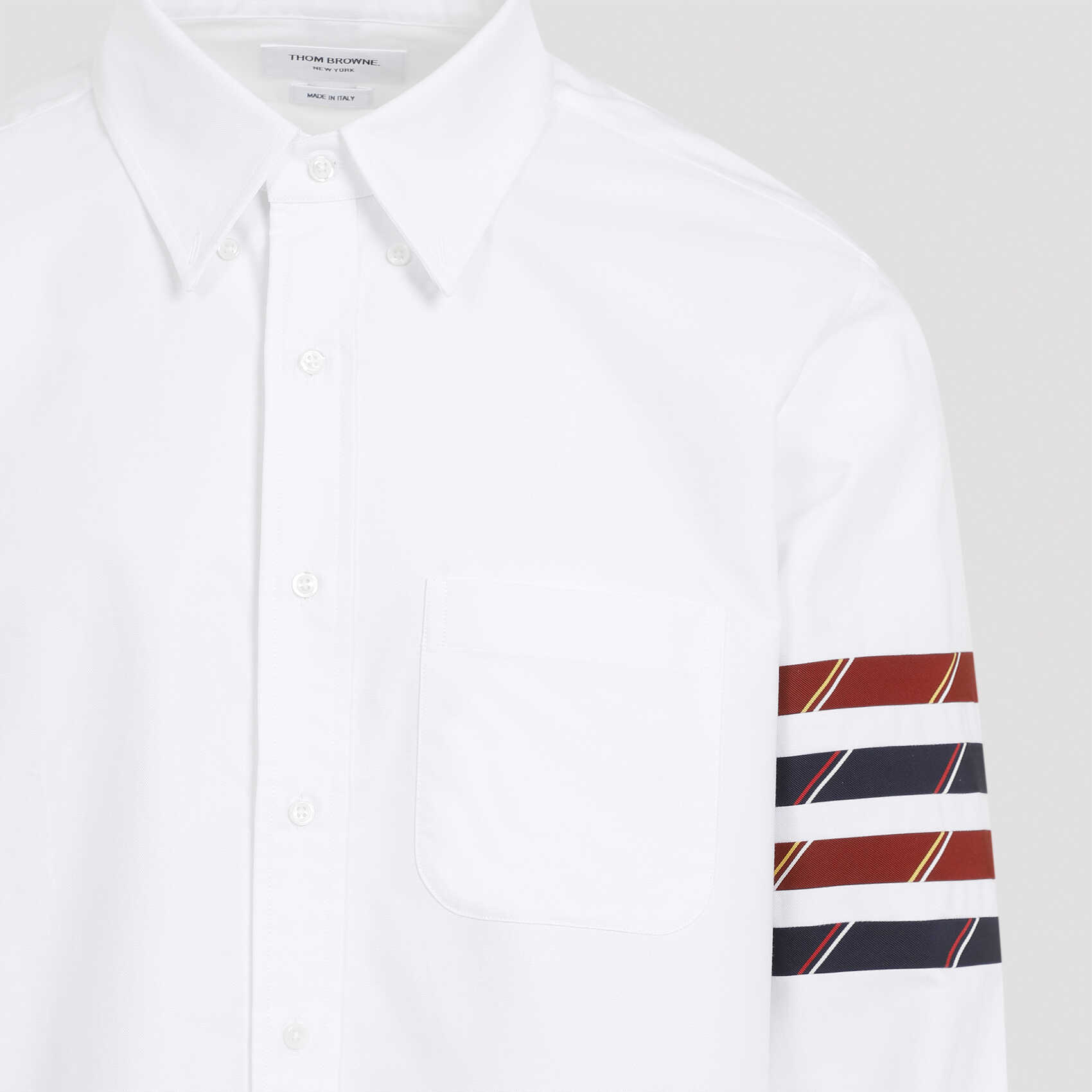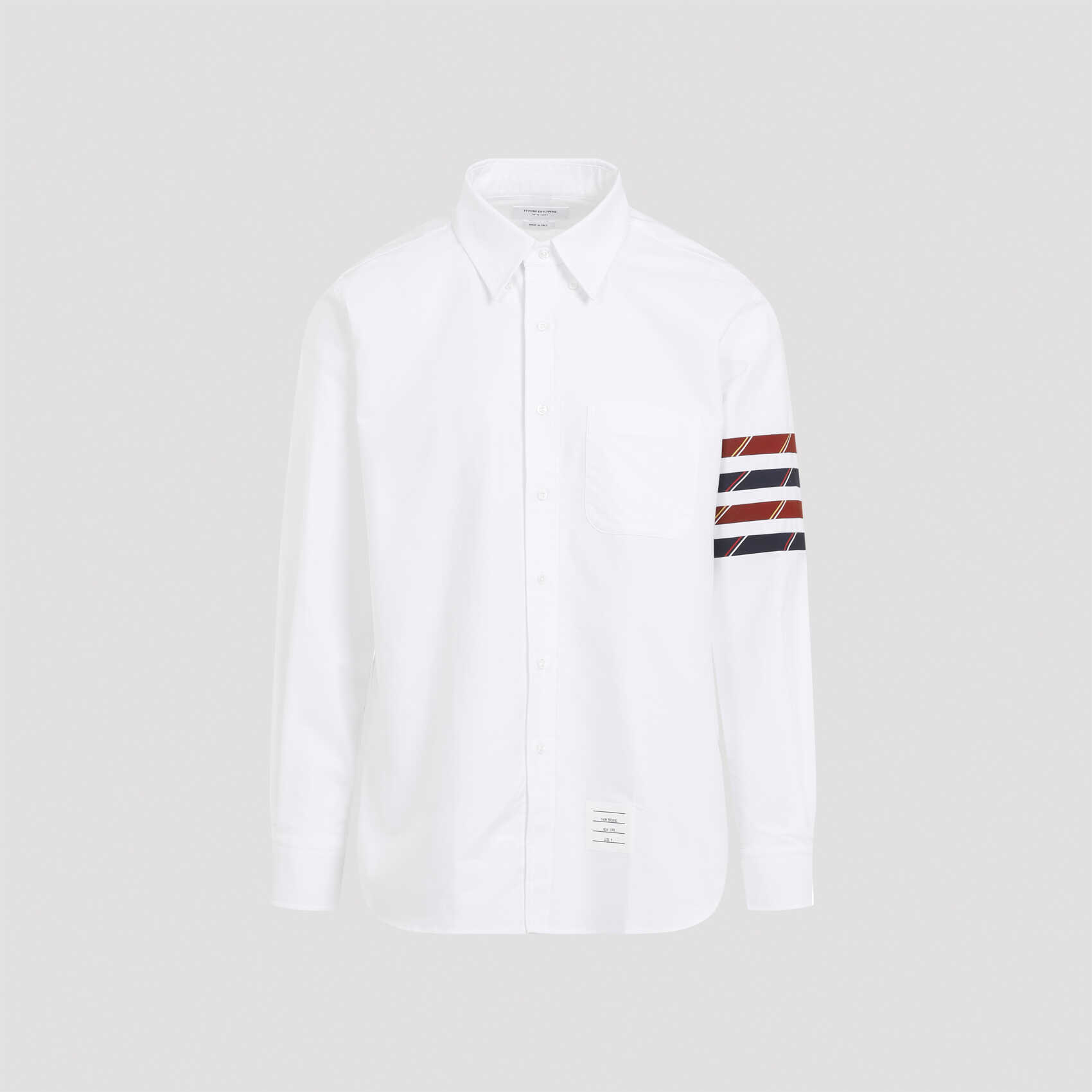 Elevate your style with this classic Thom Browne white cotton shirt. Featuring a pointed collar, front buttoned fastening, chest pocket, signature logo patch, blue and red stripe details, and buttoned cuffs. Made from 100% pure cotton for ultimate comfort and style. Perfect for any occasion.