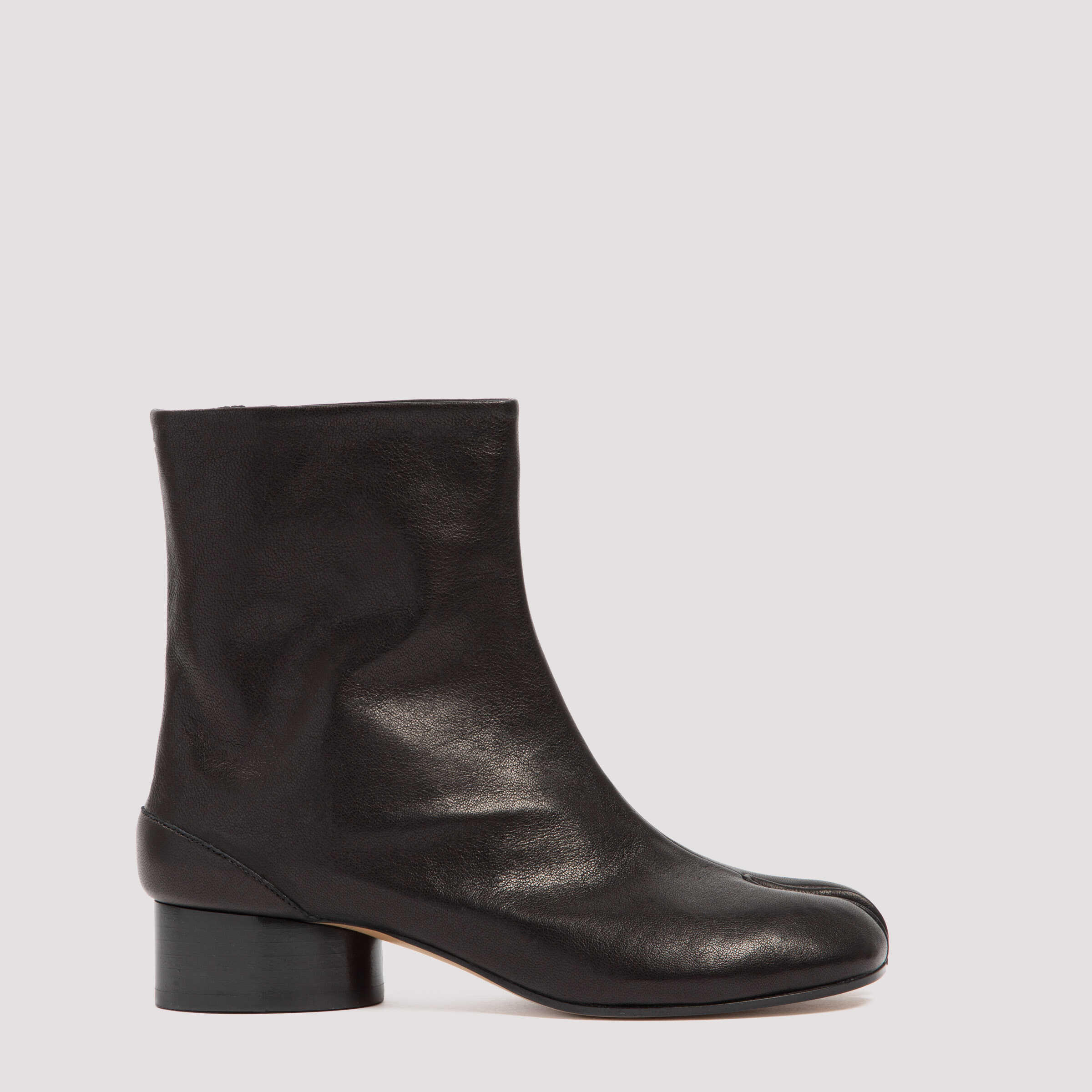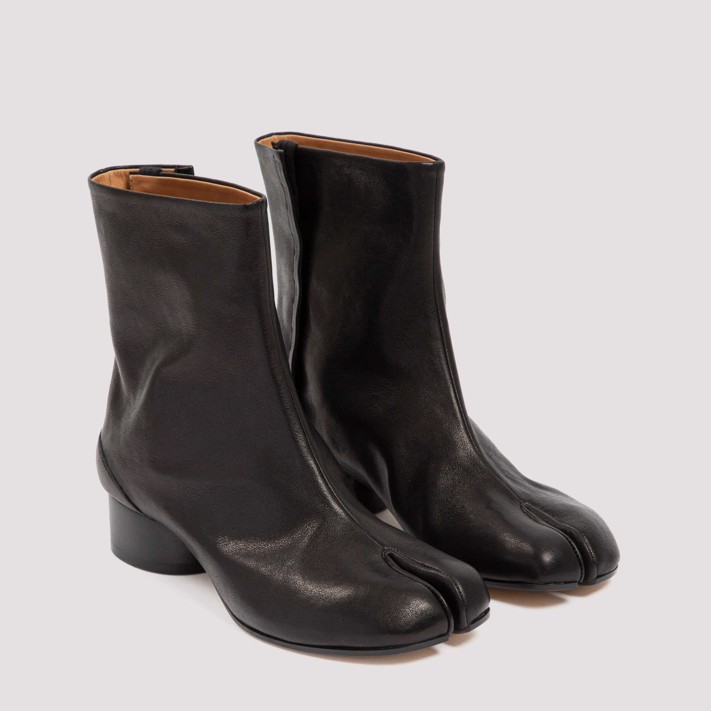 Step out in style with these Maison Margiela black leather ankle boots. Featuring a signature cleft toe, zip fastening, stacked block heels, and leather lining. Made from 100% lamb leather, these boots offer both comfort and elegance. Elevate your look with Maison Margiela.