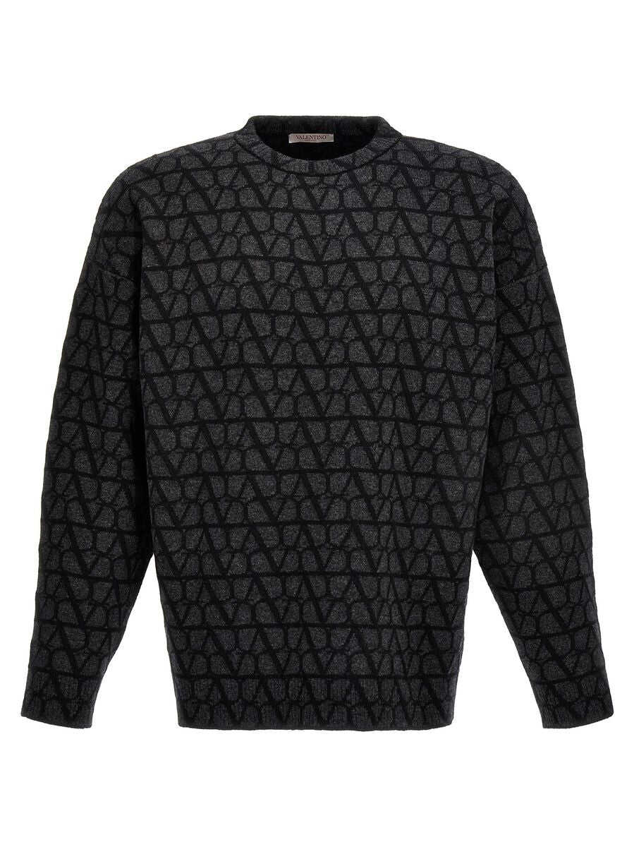 Dark grey and black wool jumper from Valentino featuring crew neck, drop shoulder, long sleeves, jacquard logo motif, knitted construction, straight hem and ribbed cuffs and hem.