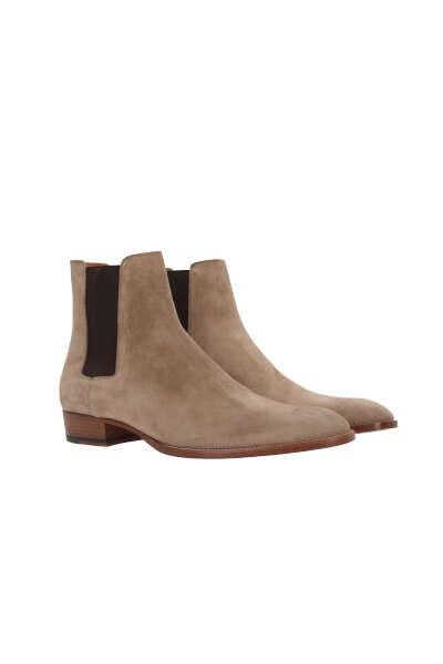 Saint Laurent's chelsea boots crafted in dark beige suede. Featuring side elasticated bands, an almond-toe silhouette, leather lining and leather sole.