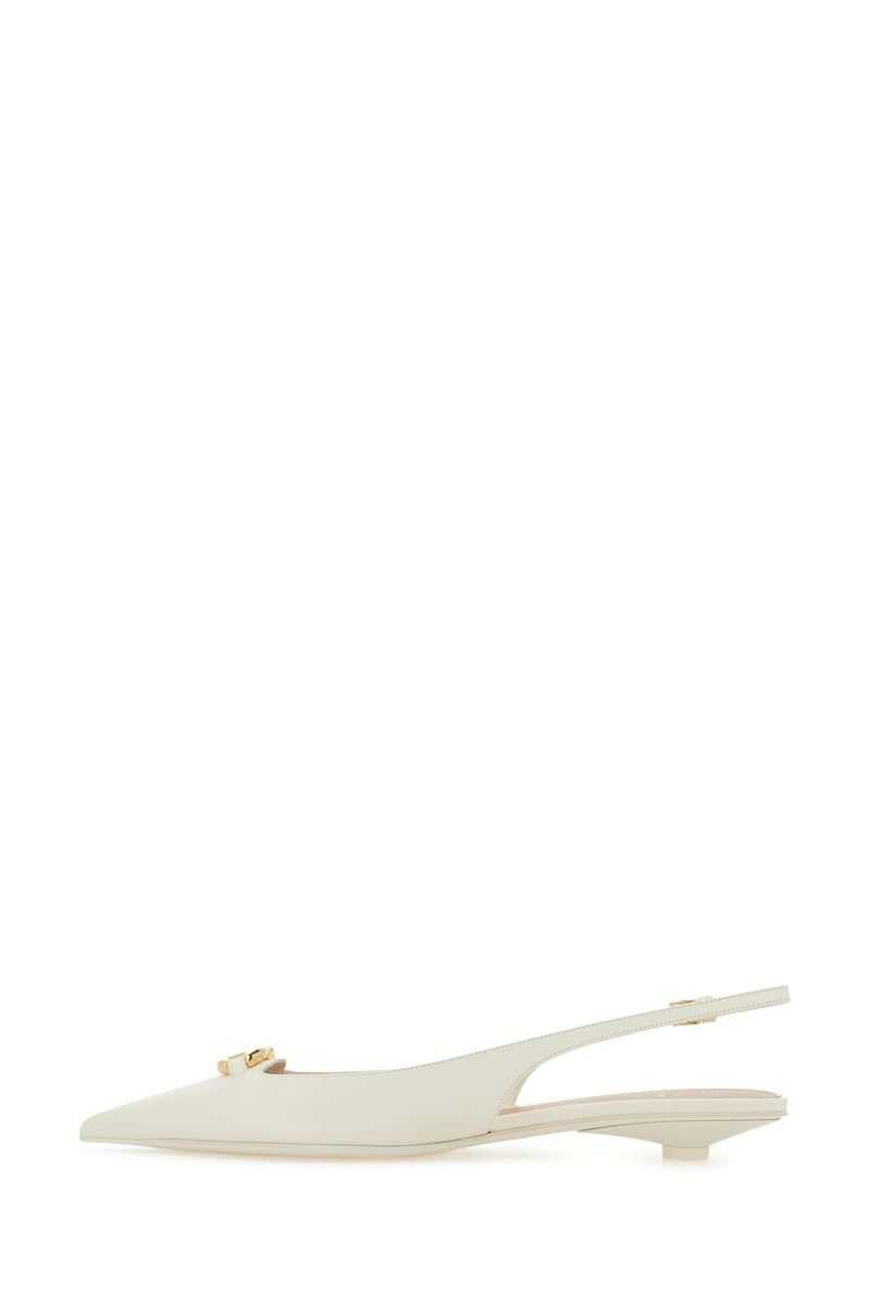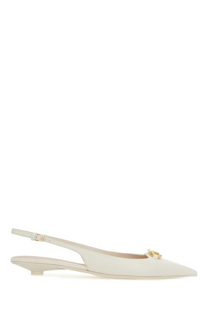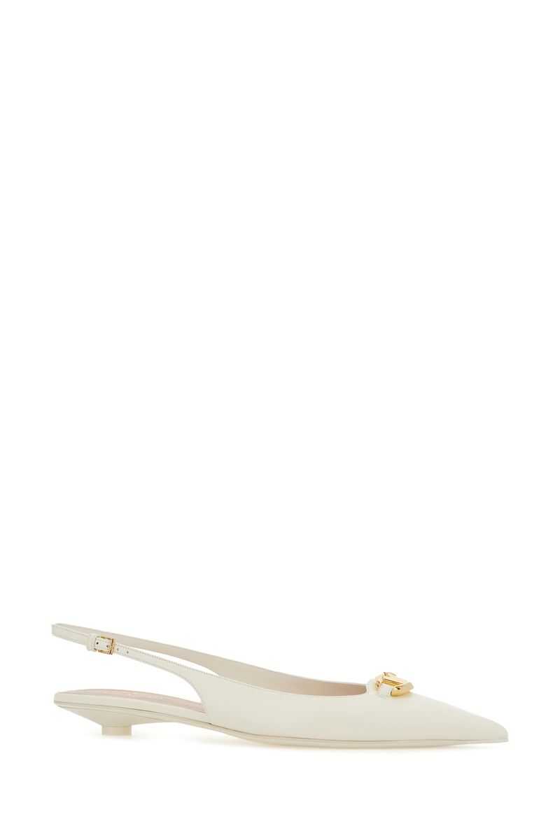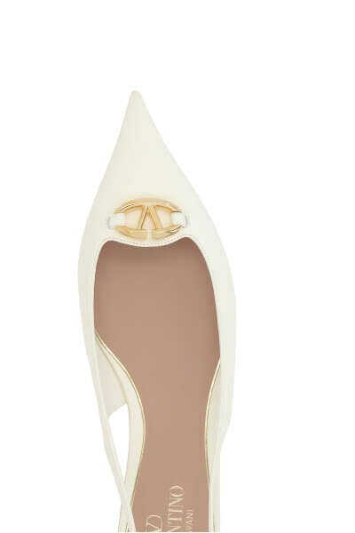 Valentino Garavani's slingbacks crafted in ivory smooth leather with the iconic gold-tone metal VLogo Signature detail. Featuring adjustable ankle strap with metal buckle, a point-toe silhouette, leather lining and leather / rubber sole. The design is completed by a lacquered kitten heel.