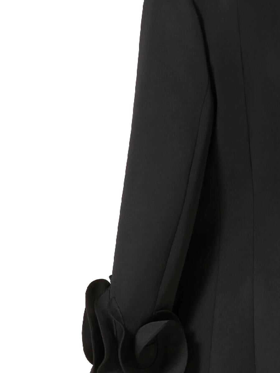 black virgin wool double-breasted button fastening dart detailing peak lapels shoulder pads rose appliqué at the cuffs long sleeves chest welt pocket two side flap pockets full lining straight hem