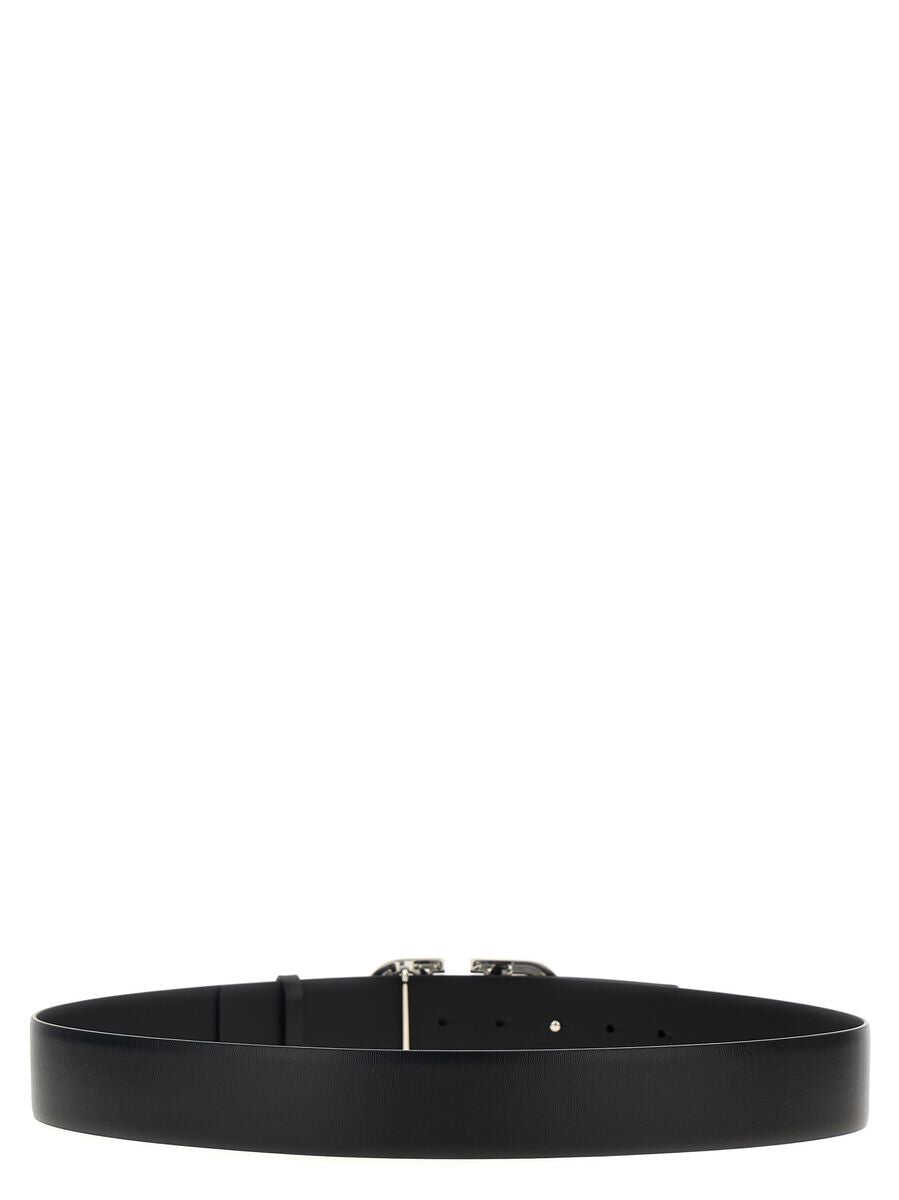 Leather belt with front buckle with silver-plated logo.