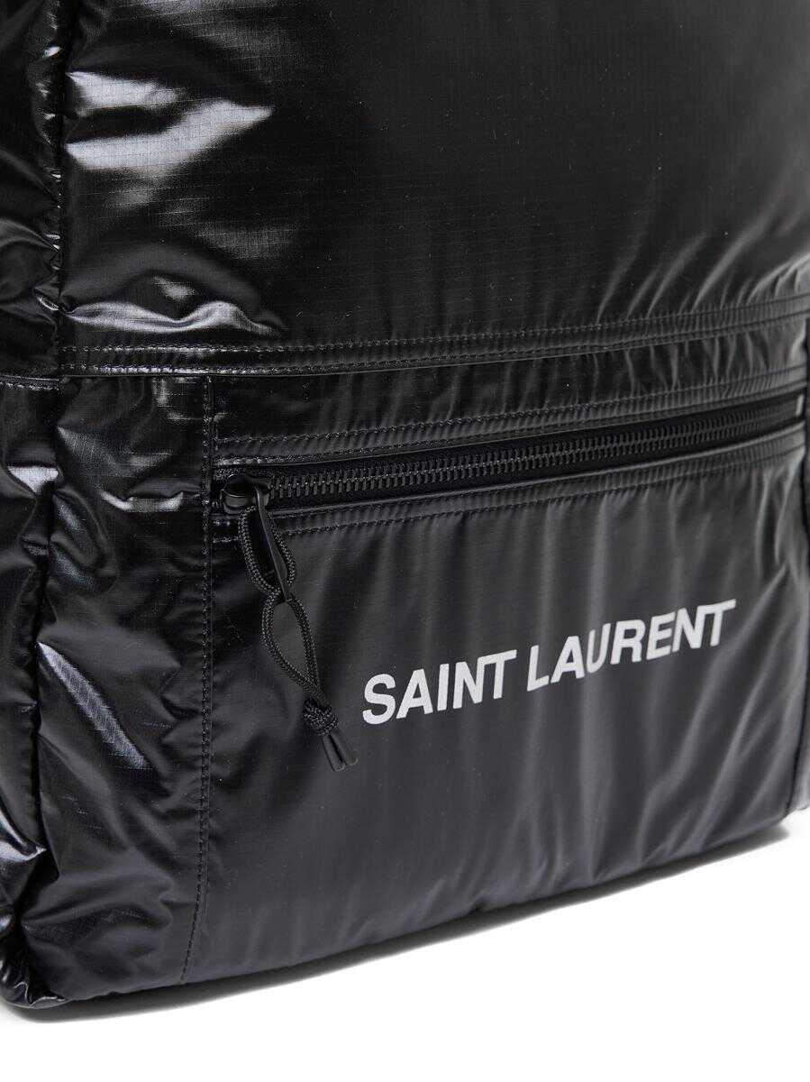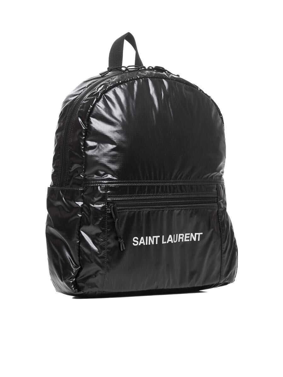 Saint Laurent's Nuxx black ripstop nylon backpack featuring a top handle, main compartment and front pocket closed by zip, white lettering logo printed on the front, side pockets, adjustable back shoulder straps and internal pockets.