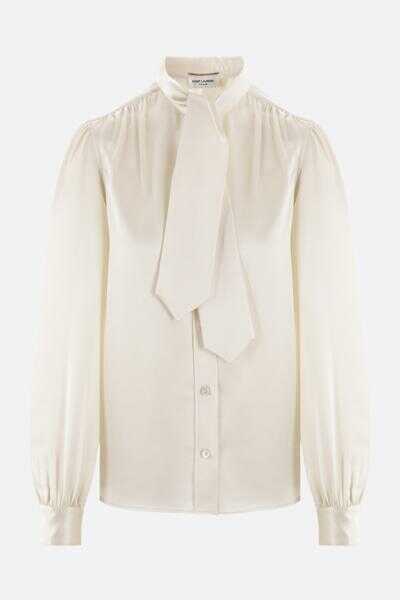 Saint Laurent's shirt crafted in ivory envers satin. Featuring lavallière at neck, button closure, long sleeves with buttoned cuffs, pleated details and curved hem.