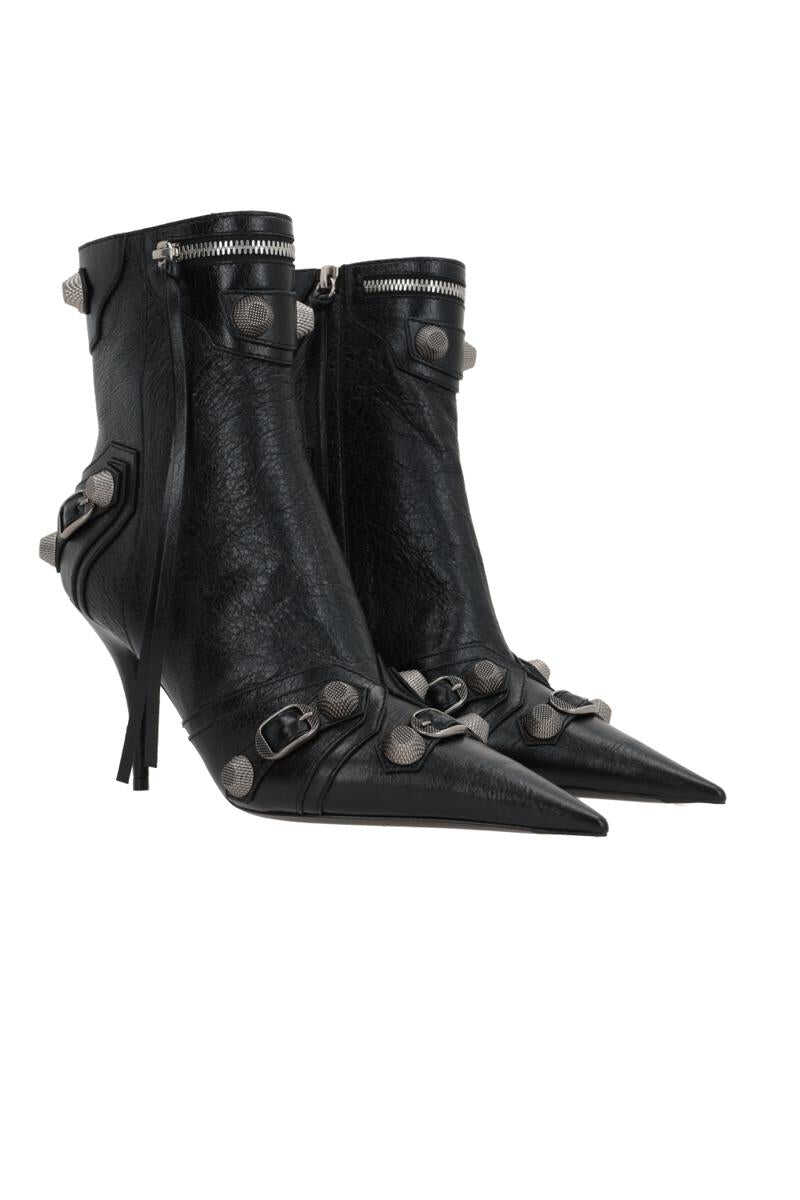 Balenciaga's ankle boots crafted in black Arena leather embellished by antique silver-tone metal studs and buckles. Featuring a point-toe silhouette, side zip fastening, leather lining and leather sole. The design is completed by a leather-covered stiletto heel.