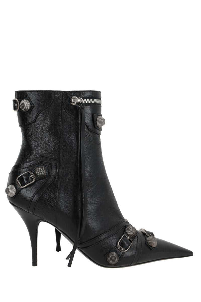 Balenciaga's ankle boots crafted in black Arena leather embellished by antique silver-tone metal studs and buckles. Featuring a point-toe silhouette, side zip fastening, leather lining and leather sole. The design is completed by a leather-covered stiletto heel.