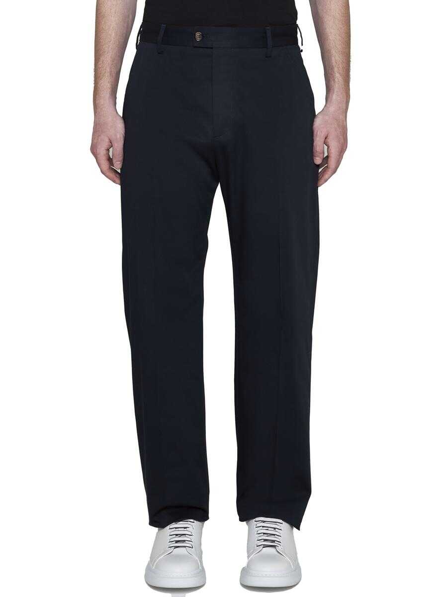 Alexander McQueen’s navy blue cotton chino trousers featuring belt loops, button and zip fly, four pocket cut and straight leg with ironed crease.