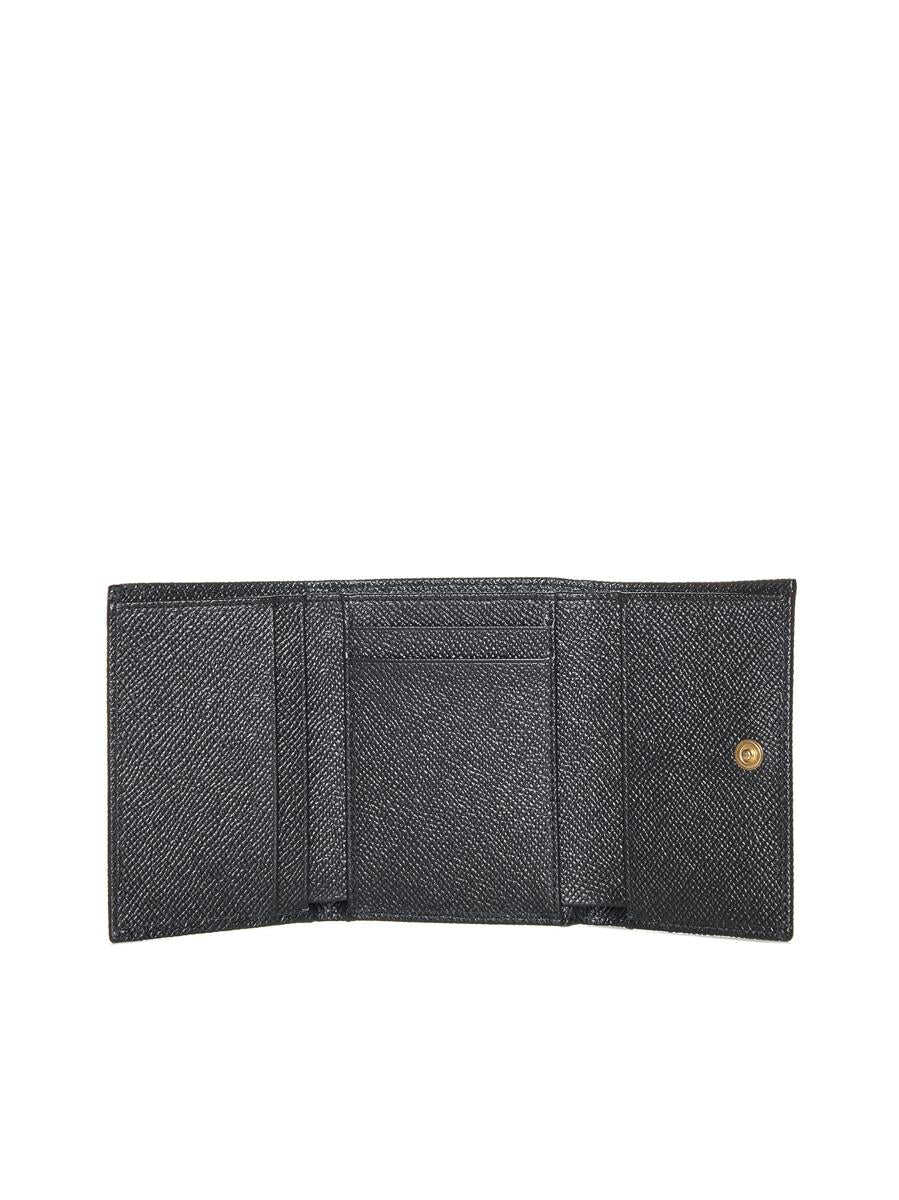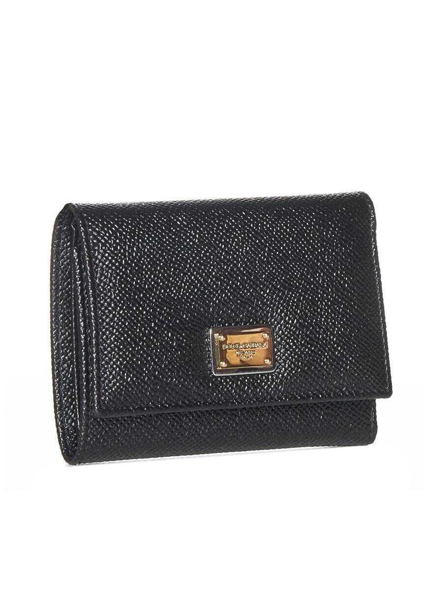 Black calf leather logo plaque tri-fold wallet from DOLCE & GABBANA featuring gold-tone logo plaque, tri-fold design, snap fastening, internal card slots, internal note compartments, zip-fastening pocket and gold-tone hardware.