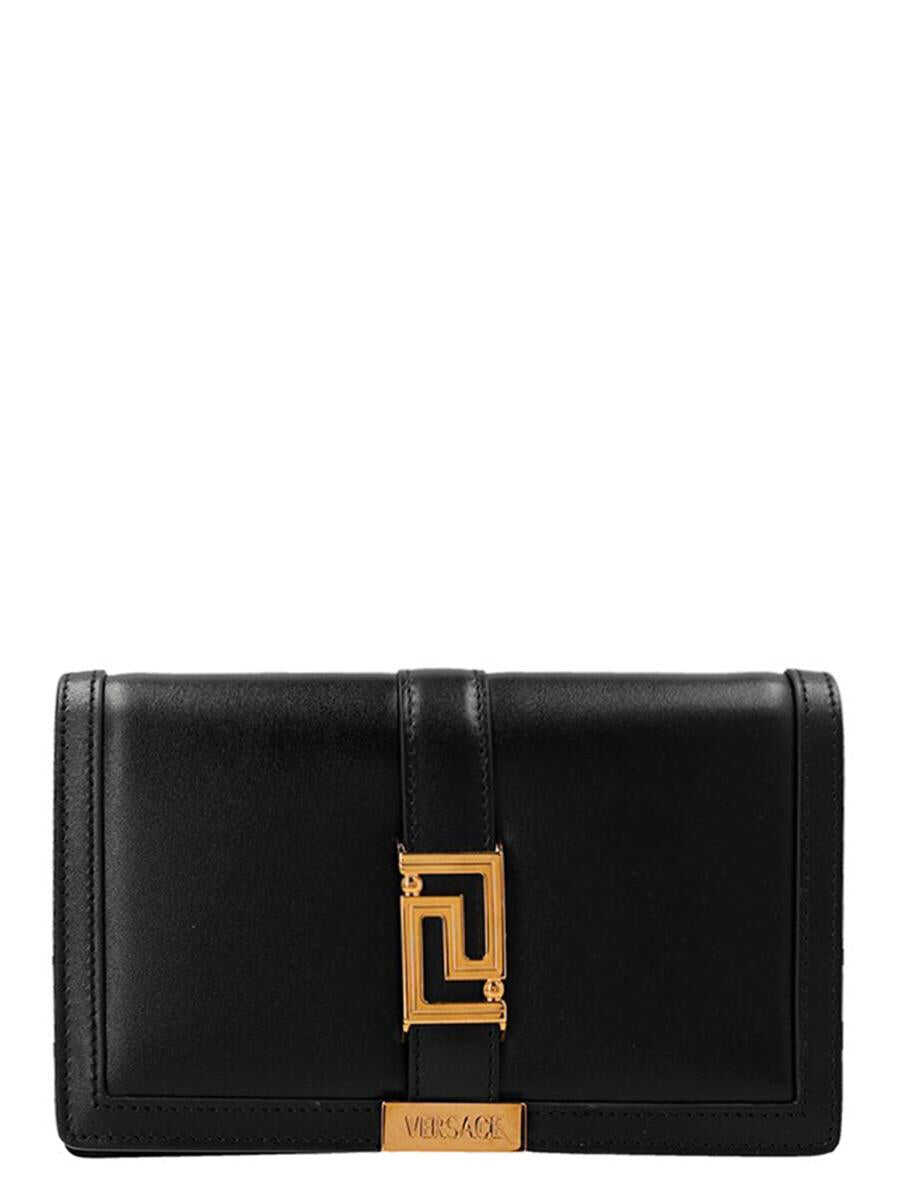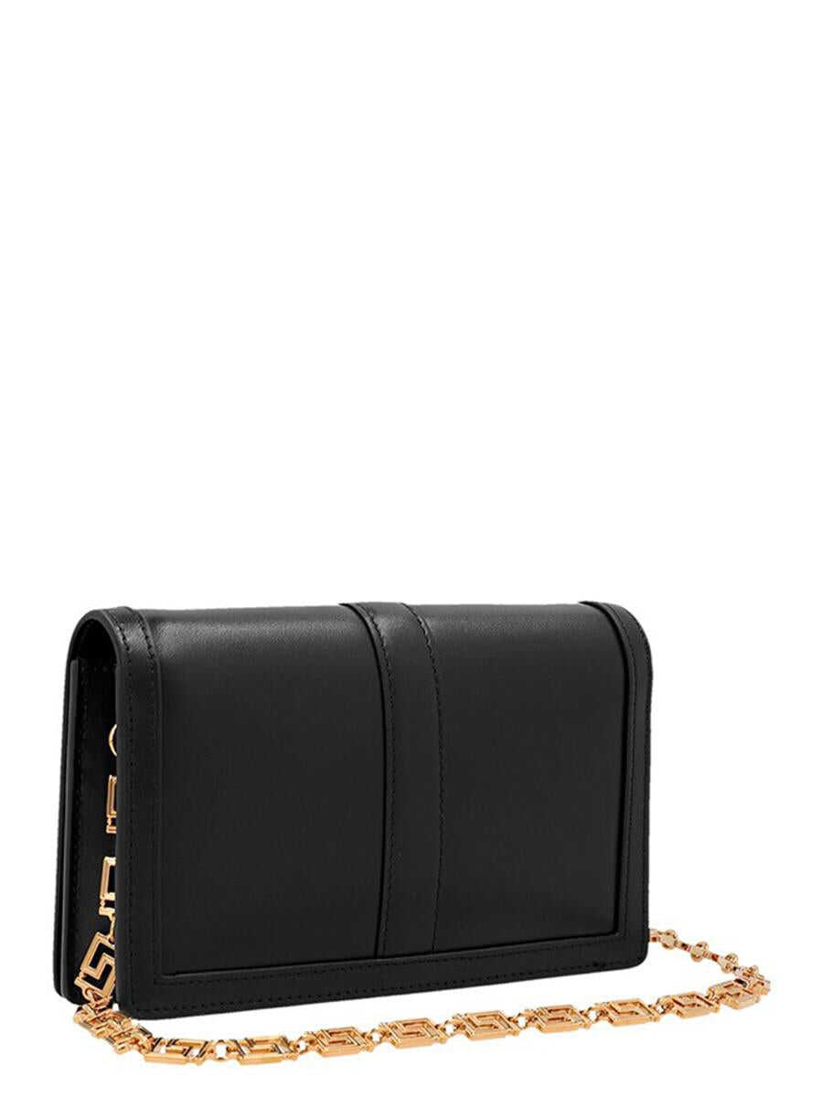 Greca Goddess' leather clutch bag with snap button closure, metal elements with Greca, a removable chain shoulder strap and a compartment with zip closure