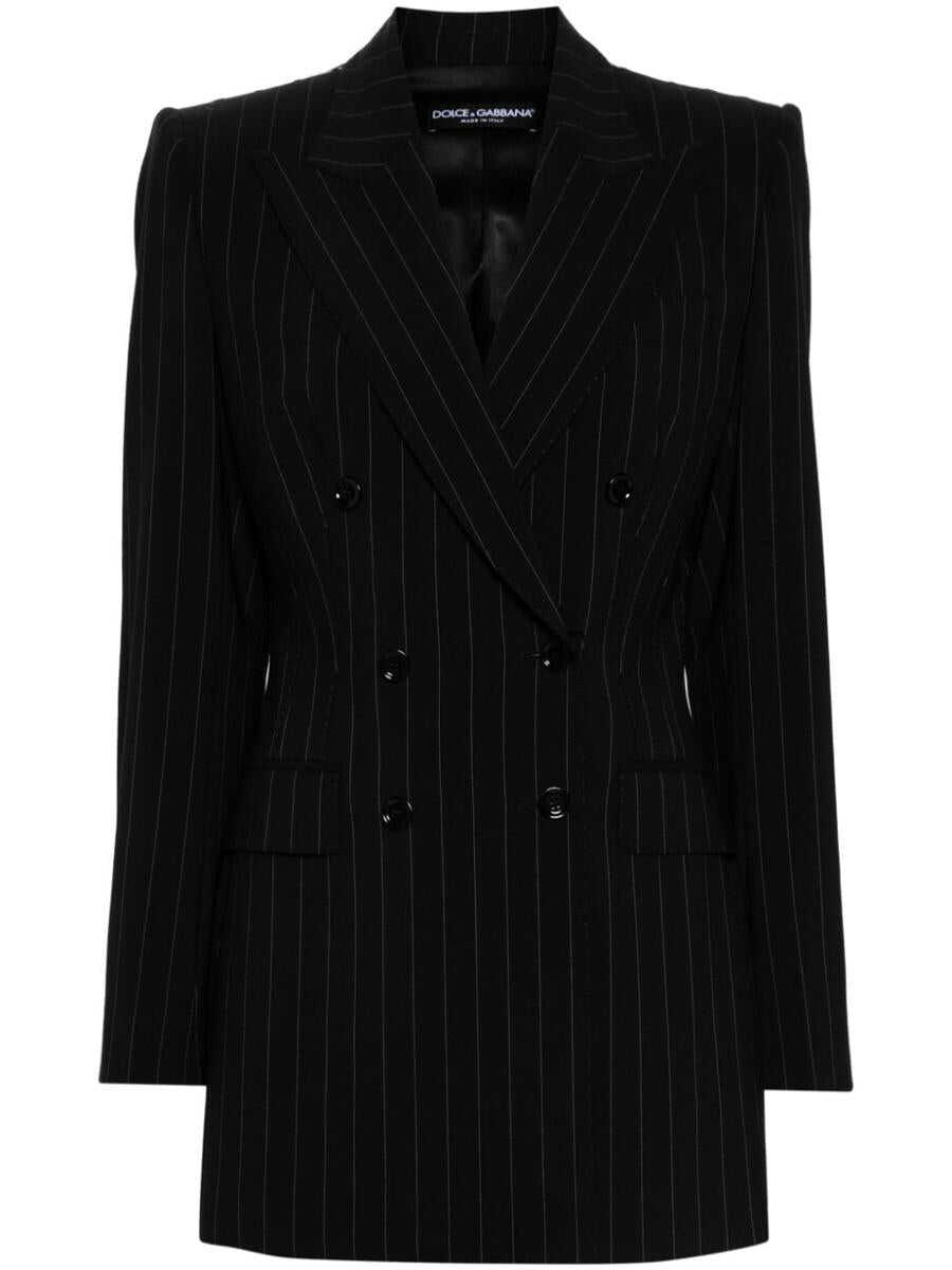 black virgin wool blend pinstripe pattern double-breasted button fastening peak lapels long sleeves buttoned cuffs chest welt pocket dart detailing two side flap pockets central rear vent full lining shoulder pads straight hem