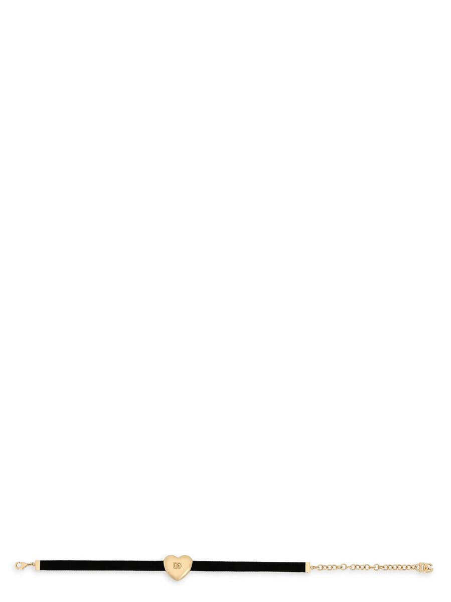 Velvet choker with gold metal heart charm, logo, adjustable metal closure