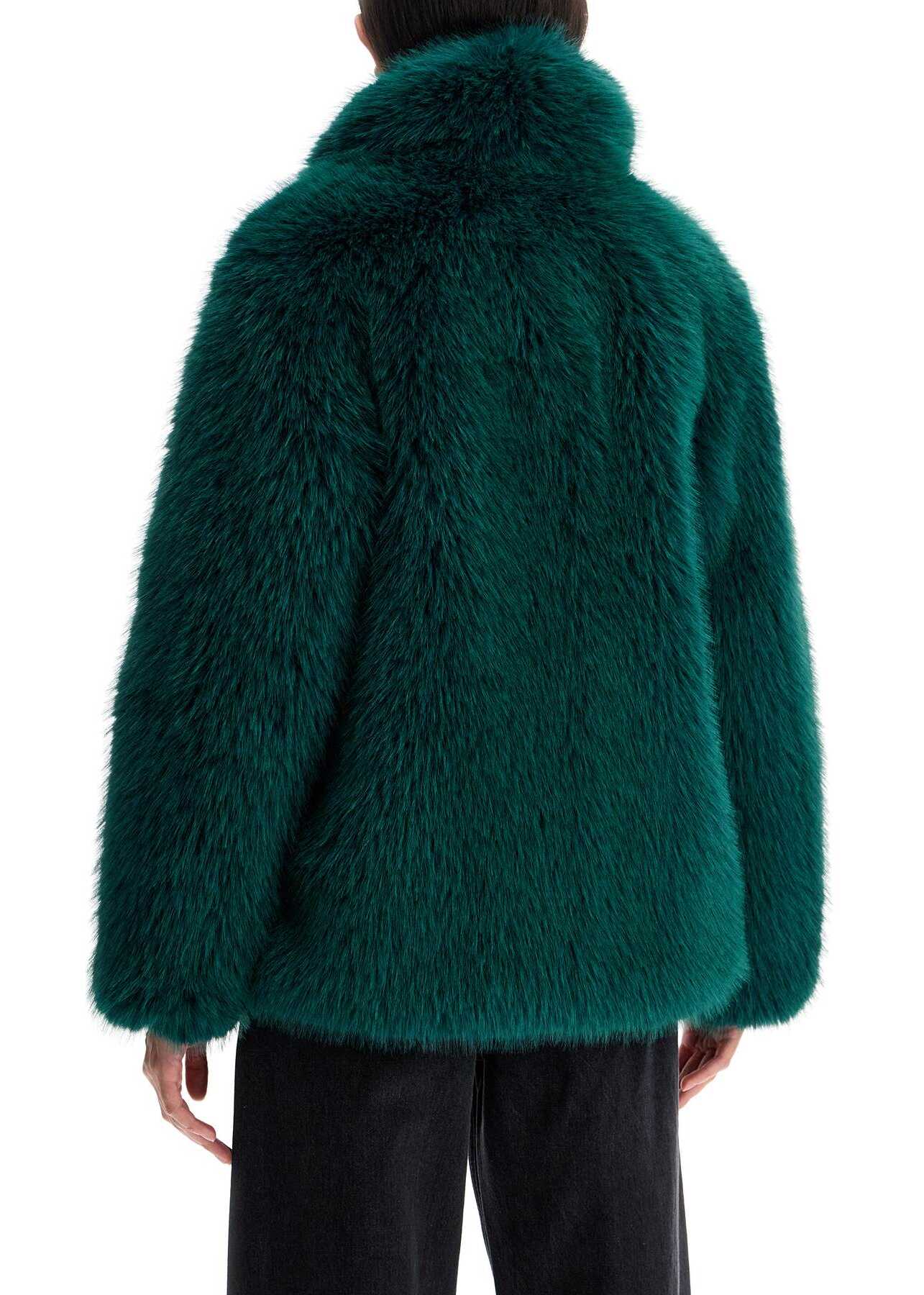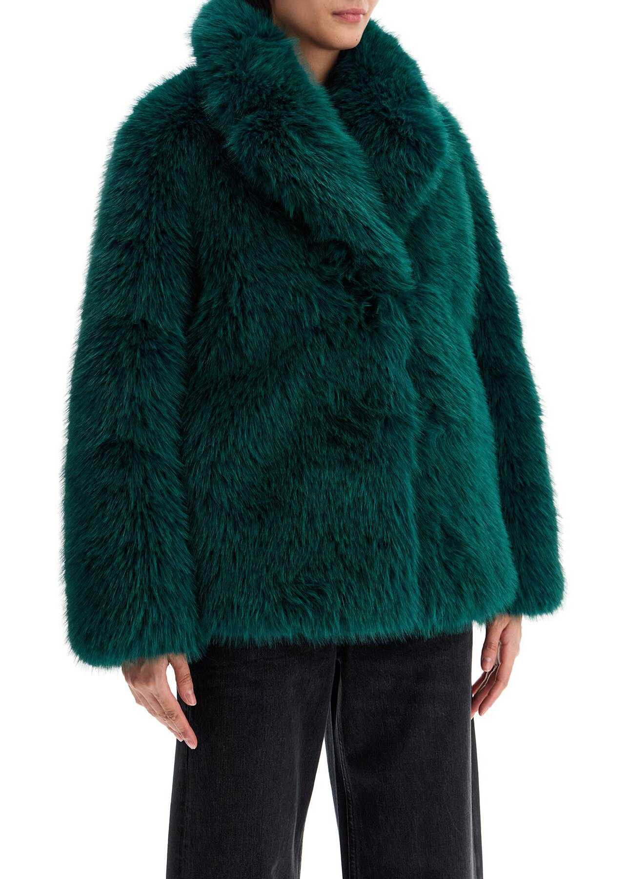 Short Stand Studio coat made of soft synthetic fur with a straight and wide cut. It features a notched collar, side pockets, and hidden hooks closure. Lined interior with a small pocket. The model is 177 cm tall and wears EU size 34.
