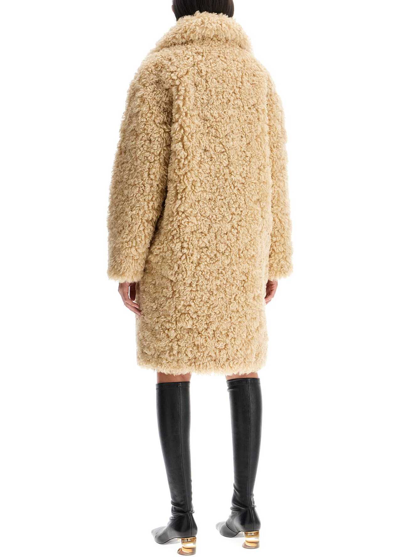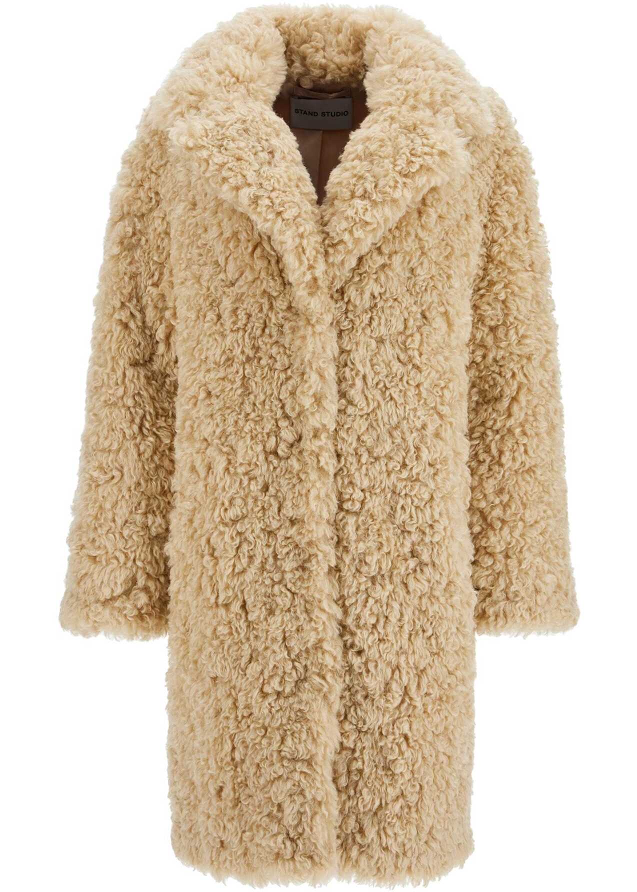 Stand Studio single-breasted coat made from curled faux fur to an oversized, cocoon silhouette with knee length, featuring a hidden snap fastening and wide lapels. It is finished with two hand pockets and an inside pocket. Full lining. The model is 177 cm tall and wears a size EU 34.