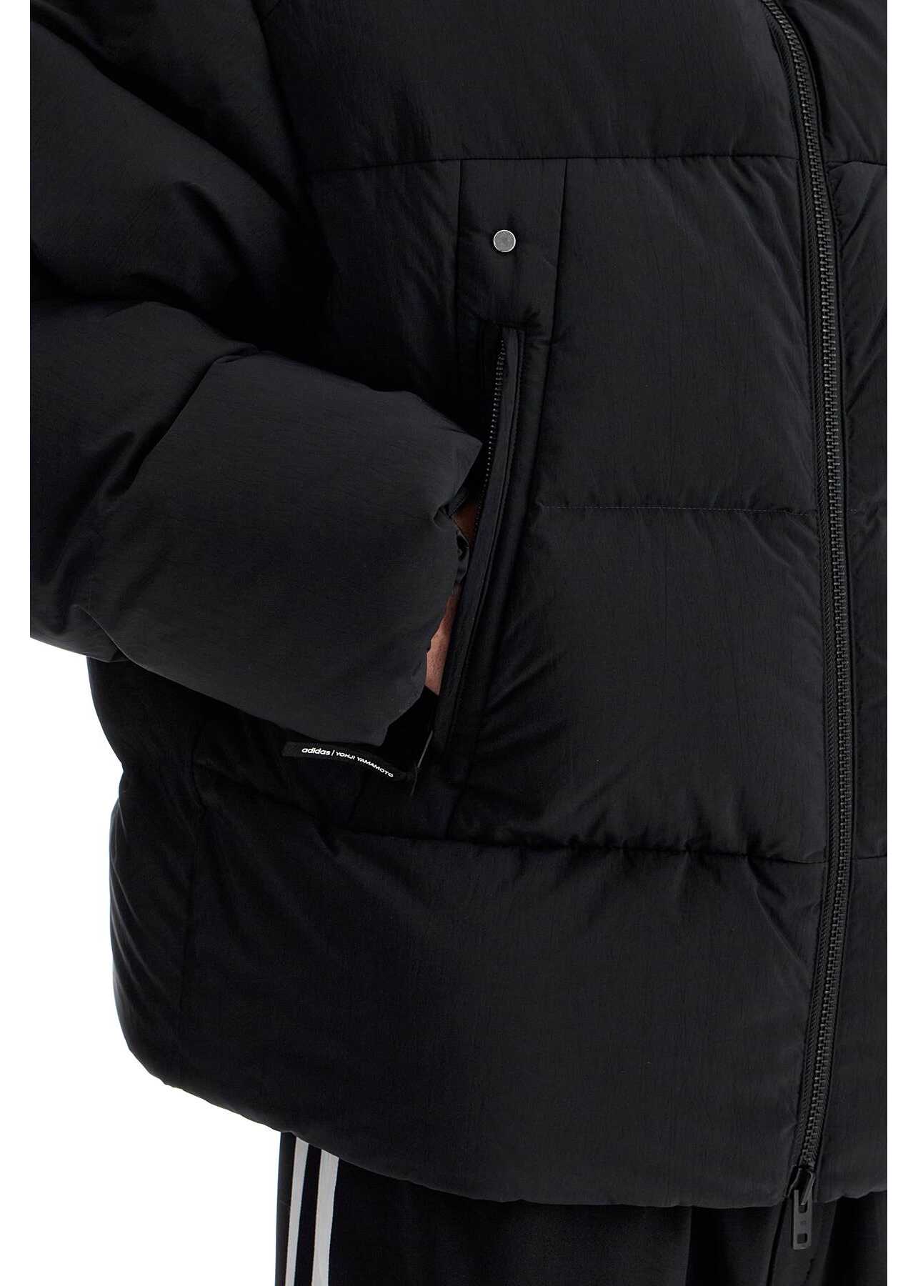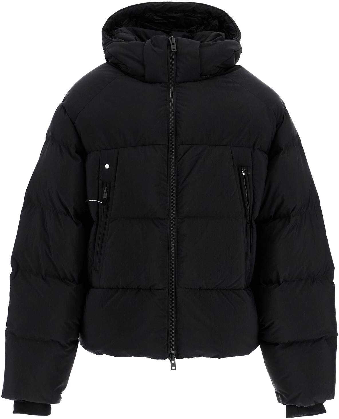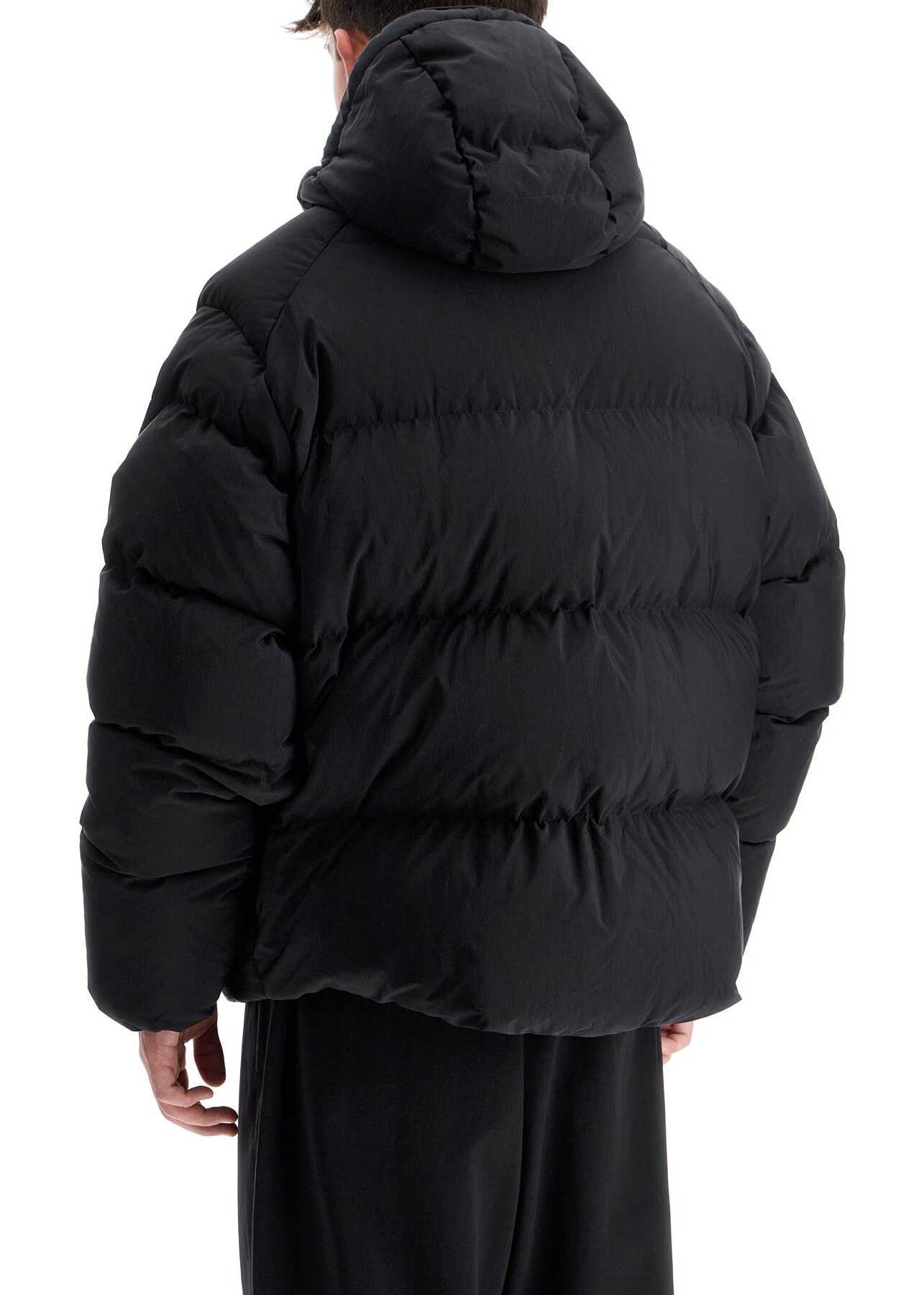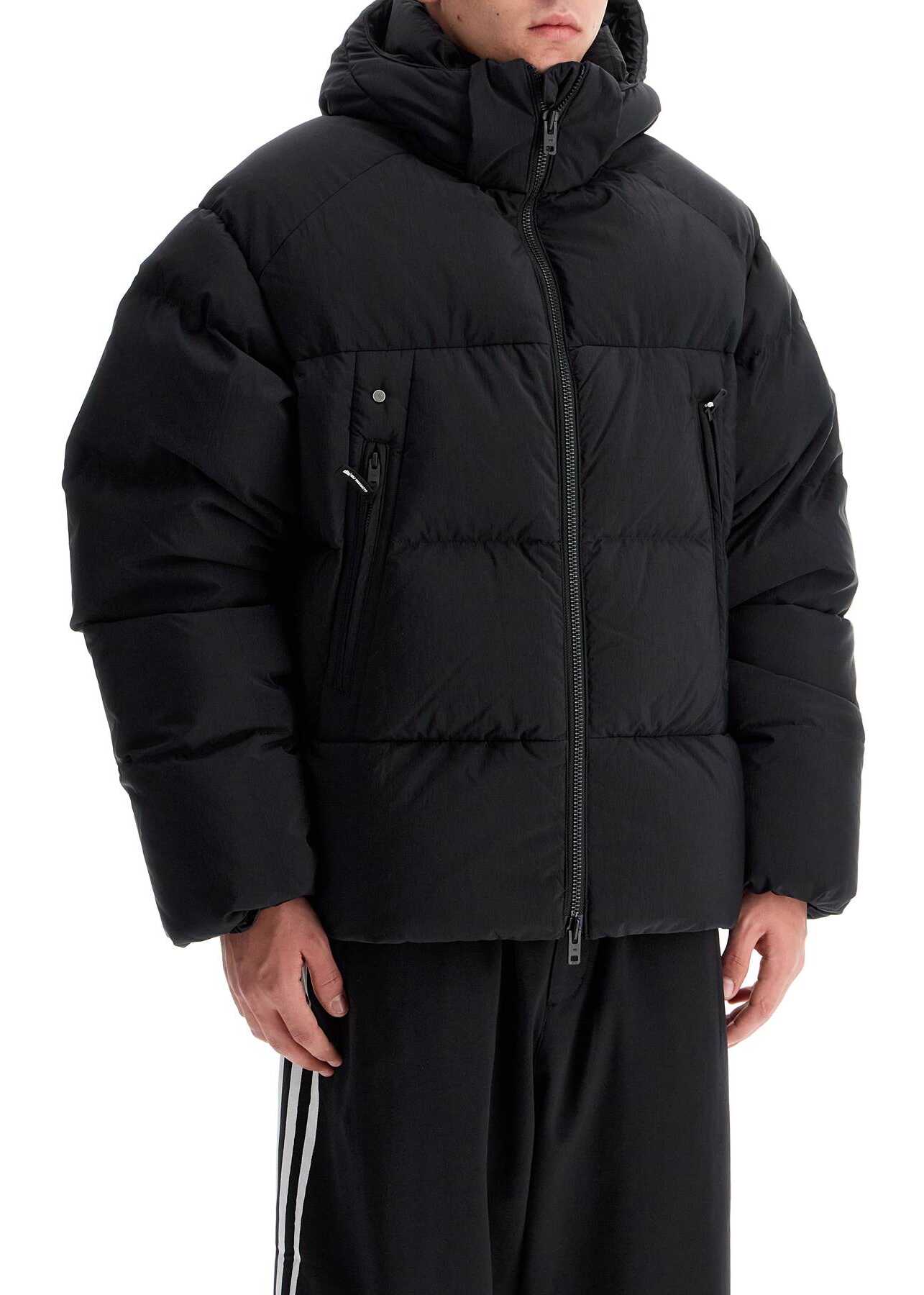 The Y-3 quilted jacket is made of recycled Pertex Quantum nylon and filled with feather padding. It has a relaxed fit with a high collar and detachable hood, complete with zippered side pockets, elasticized cuffs, adjustable hem, and two internal pockets. The model is 182 cm tall and wears size M.