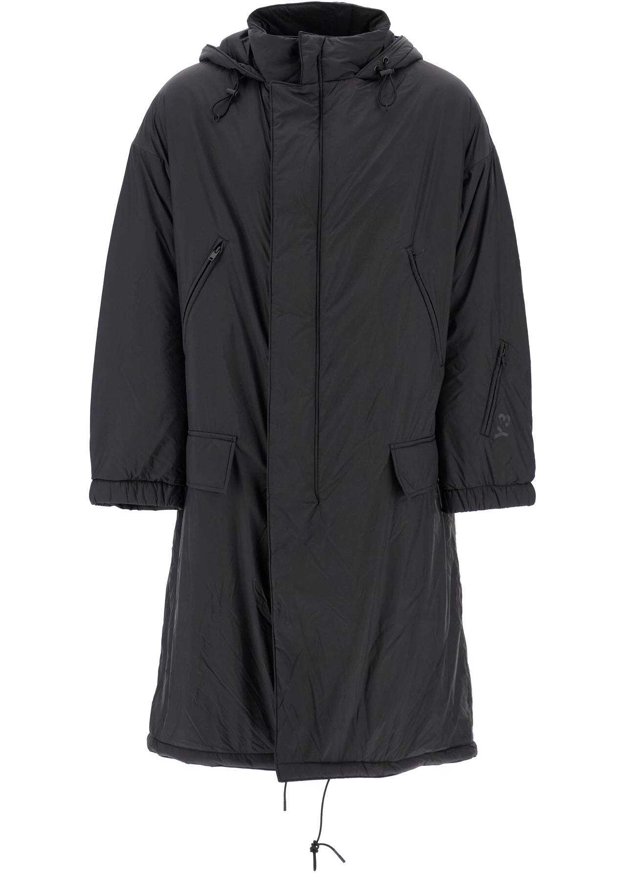 The Y-3 adjustable hood parka is made of lightweight recycled nylon ripstop with a long and oversized cut. It features a light Primaloft synthetic padding made from recycled fibers, four external pockets, an internal pocket, adjustable elastic cuffs, adjustable hem, and an inner drawstring at the waist. The model is 182 cm tall and wears size M.
