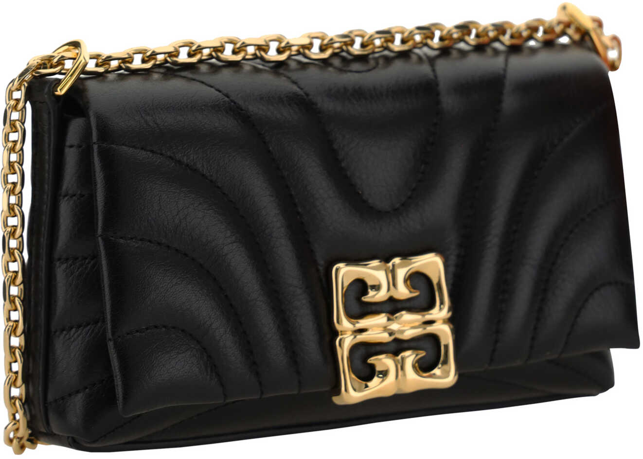 Leather Wallet by Givenchy, removable chain shoulder strap, front magnetic flap closure, three-dimensional iconic brand logo plaque appliqué on front, all-over quilted design, One main compartment and one card slot inside, iconic brand monogram press-stamped on back.