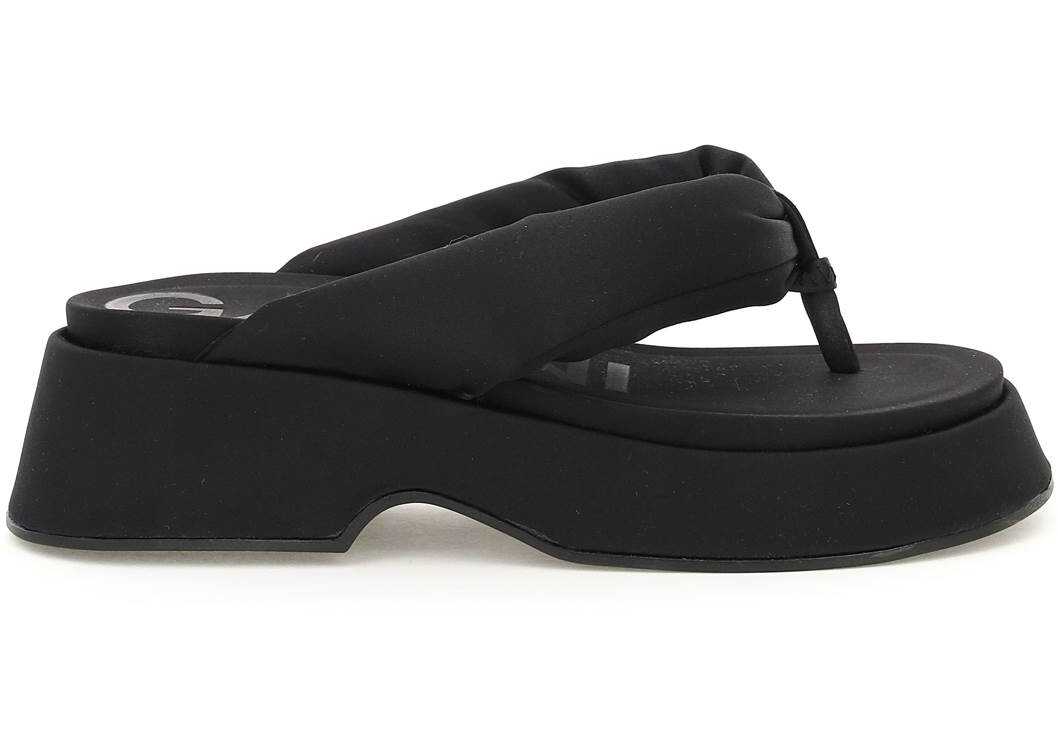 Ganni slides characterized by the oversized padded satin thong straps. Satin-coated insole and flatform, rubber sole.