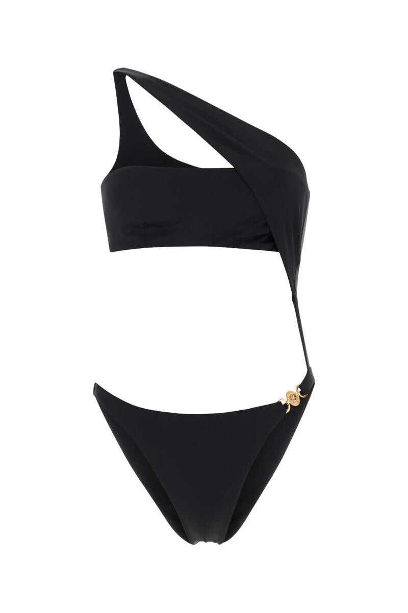 One-piece swimsuit. Stretch fit. Medusa pin detail on the brief.