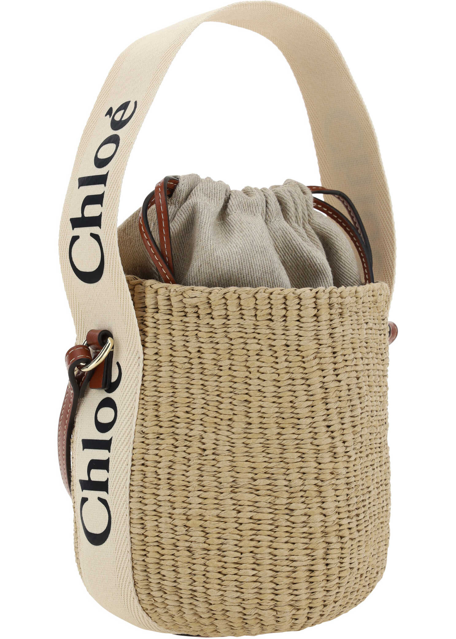 The Mifuko Bucket Bag by Chloé combines craftsmanship and contemporary style. Made of raffia, it features an interior pouch with drawstring closure, cotton handle with contrasting repeated logo and fixed leather shoulder strap. A leather welt pocket with press-stamped logo completes the design, making the accessory practical and distinctive.