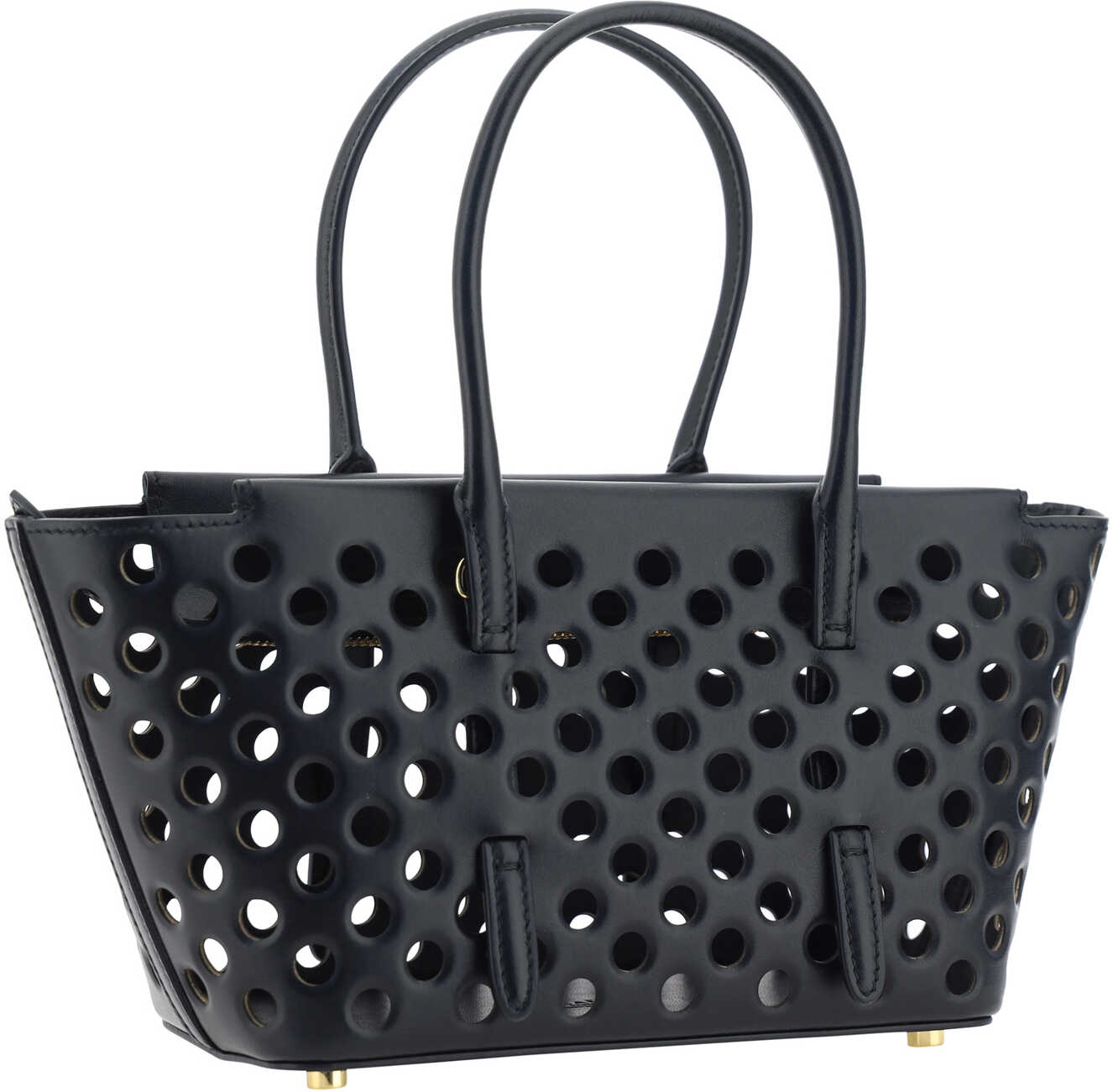 Leather Neo Mina Shoulder Bag by Alaïa, double round and rigid top handles, iconic Neo Vienne perforated design applied to side panels, metal support feet at the base of the bag.