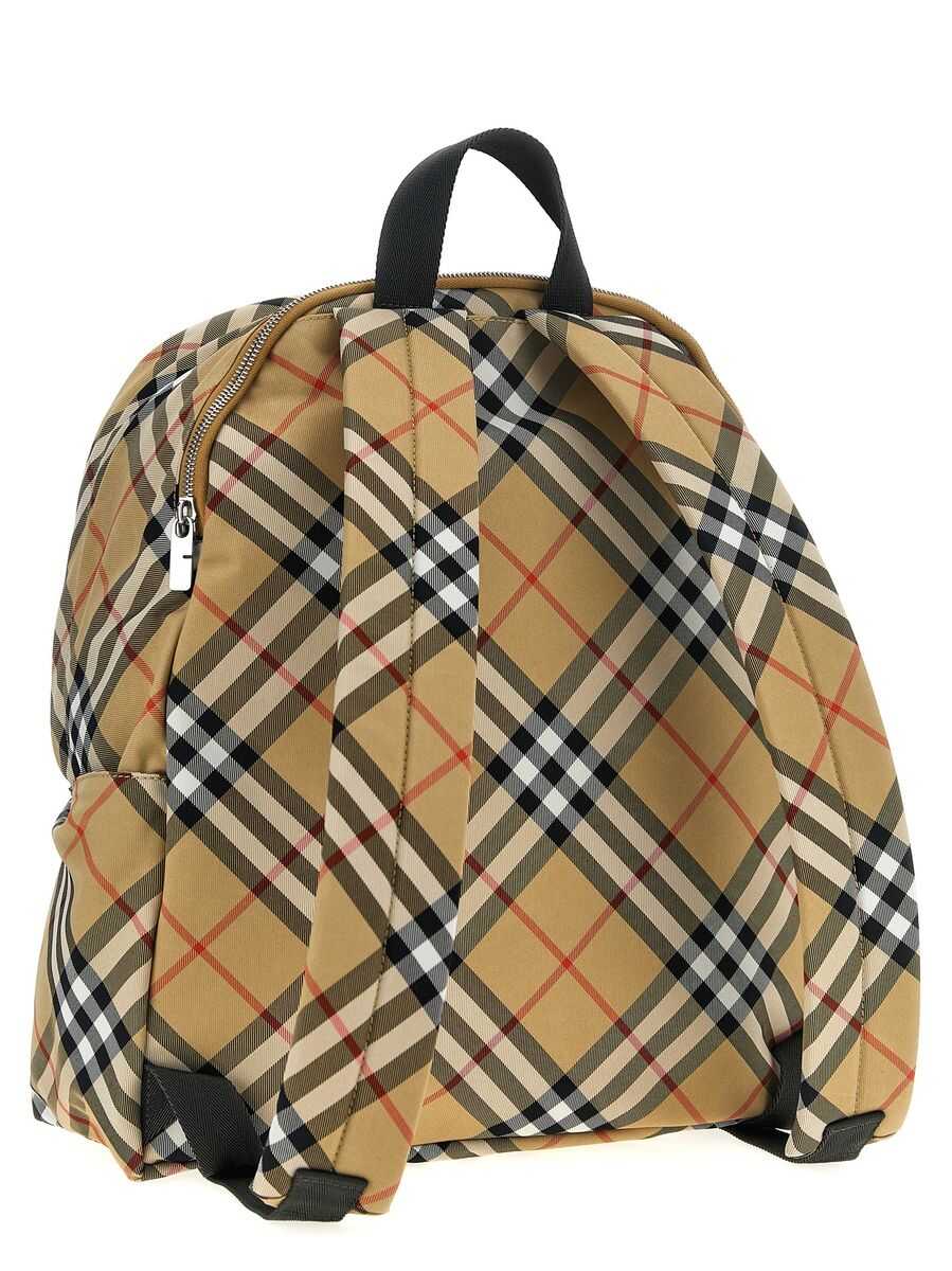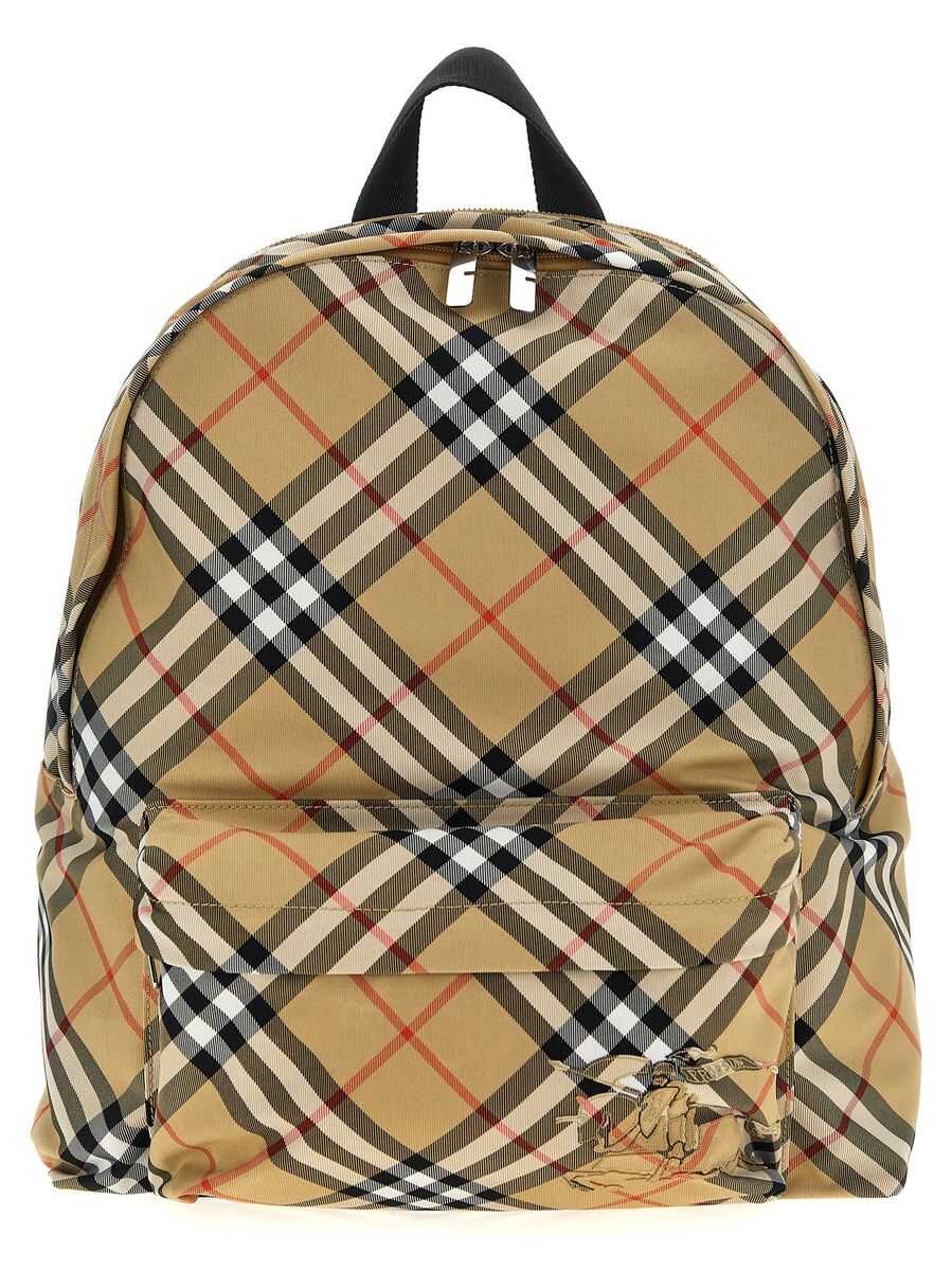 Check fabric backpack, front EKD logo application, outer zip pocket, zip closure, adjustable shoulder straps