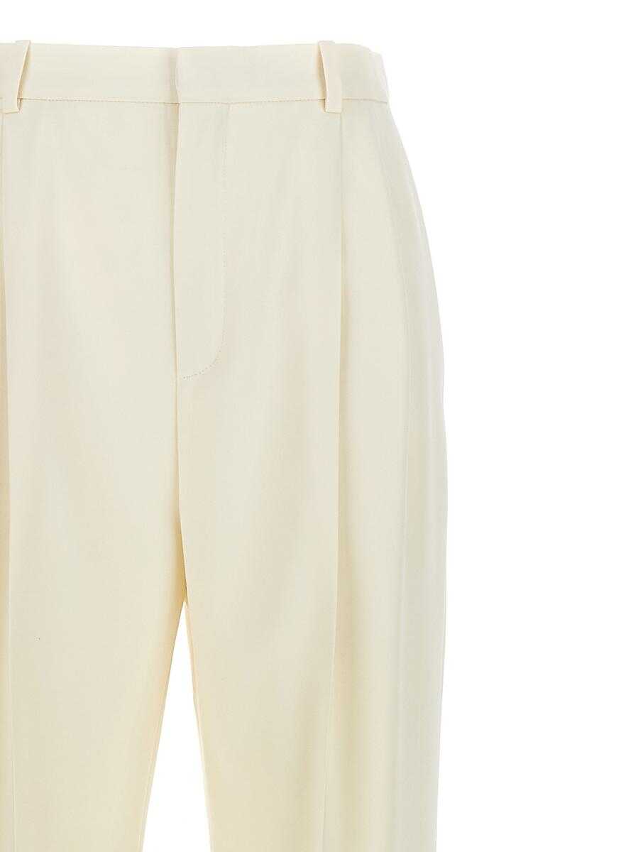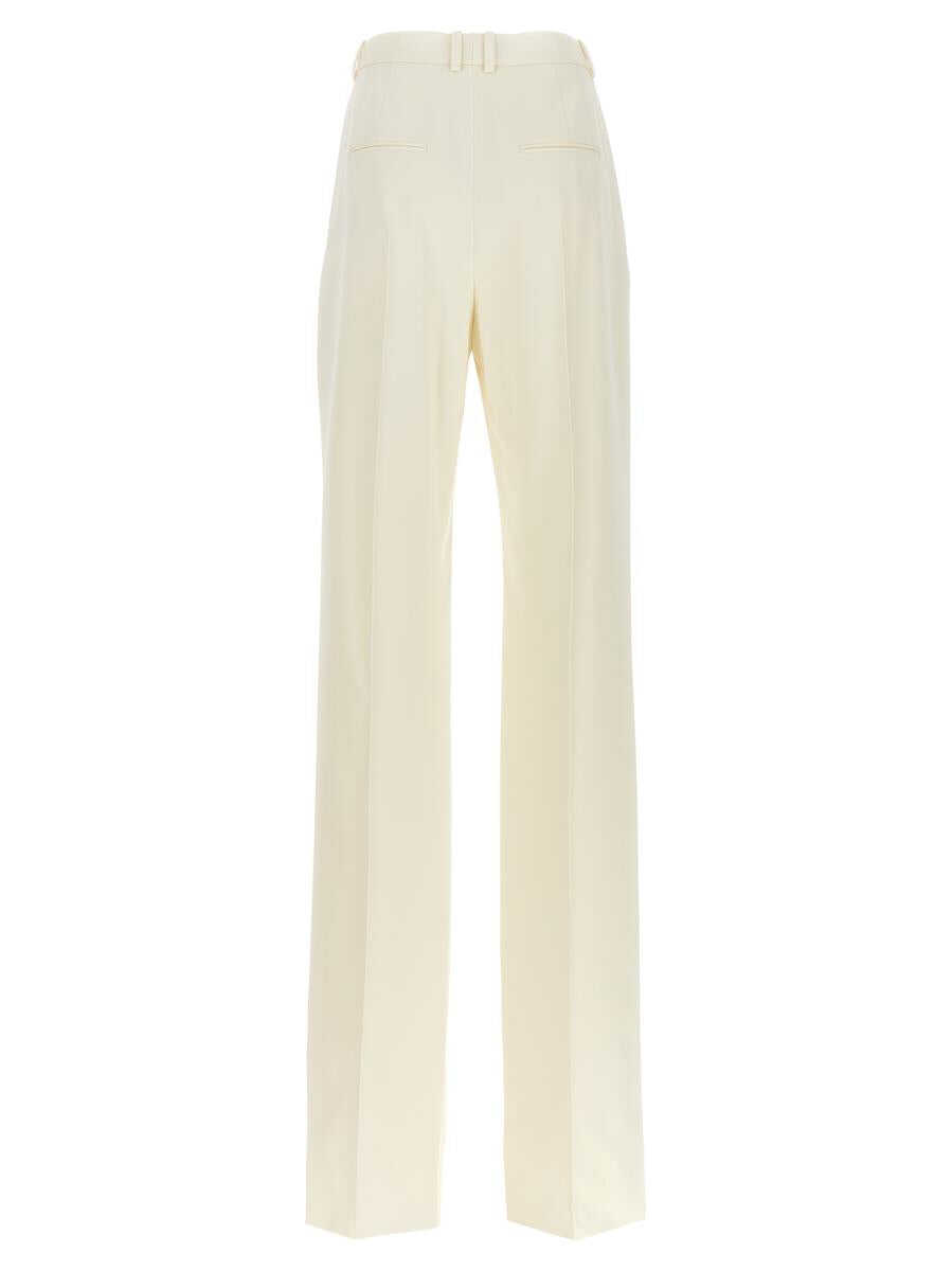 Wool gabardine trousers, hook and button zip closure, double pence and central crease, pockets