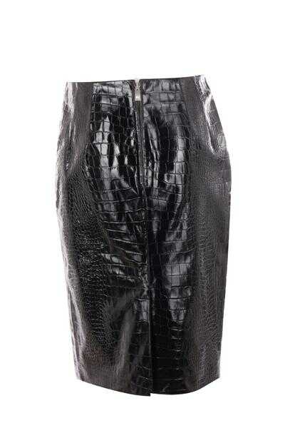 Versace's midi skirt crafted in black shiny leather with relief crocodile-effect. Featuring back zip closure, back slit and straight hem. Lined interior.