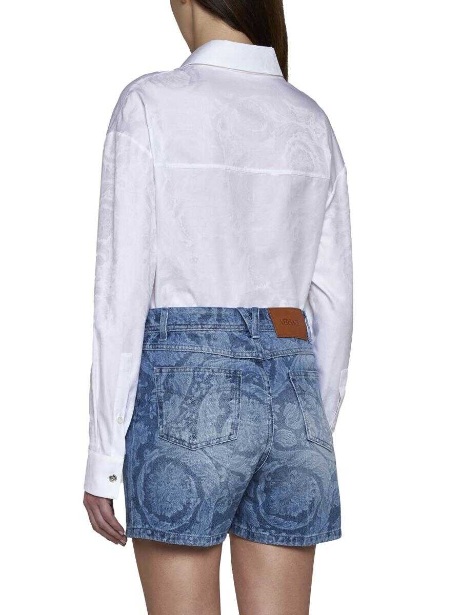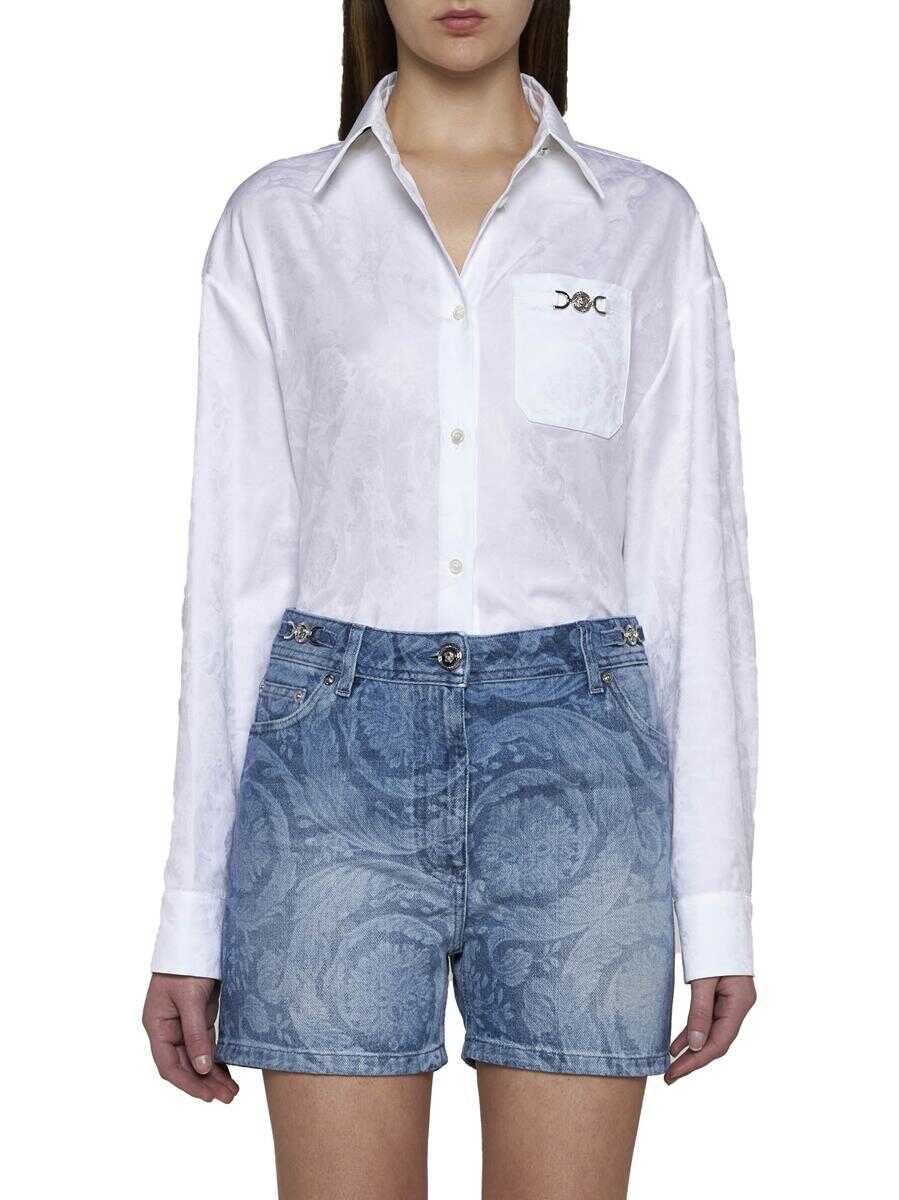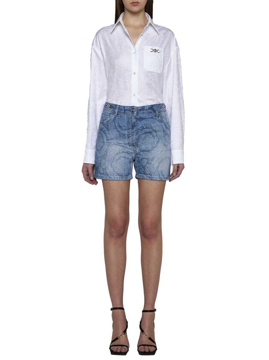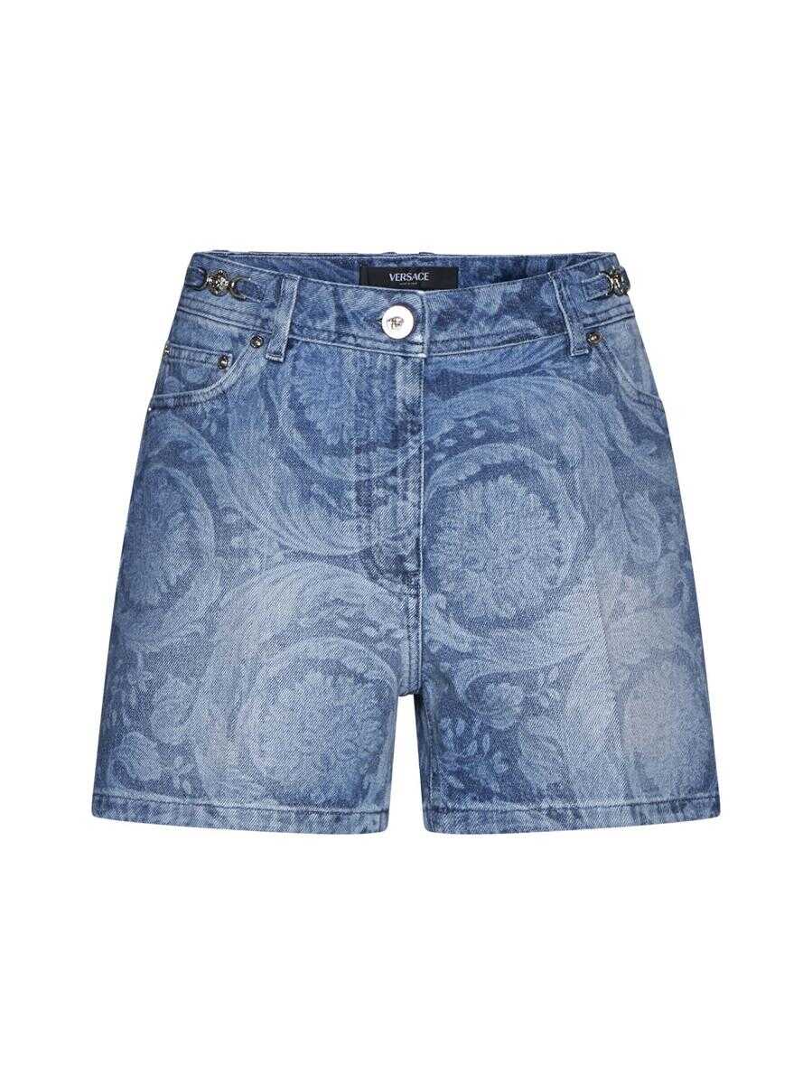 Versace’s Barocco denim shorts in shades of blue featuring belt loops, button and zip fly, Medusa side buckles, five pocket cut and logo label on the back.