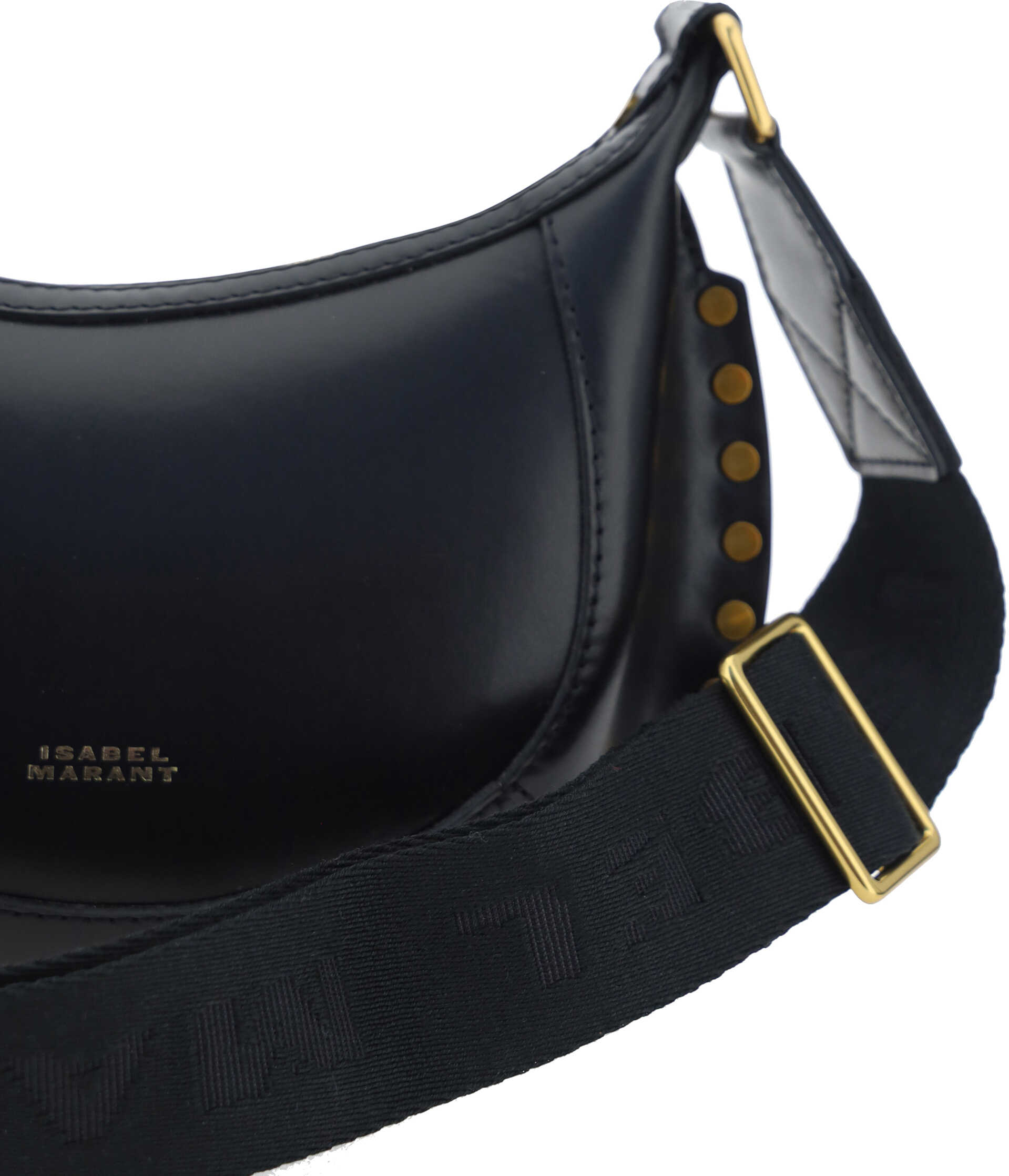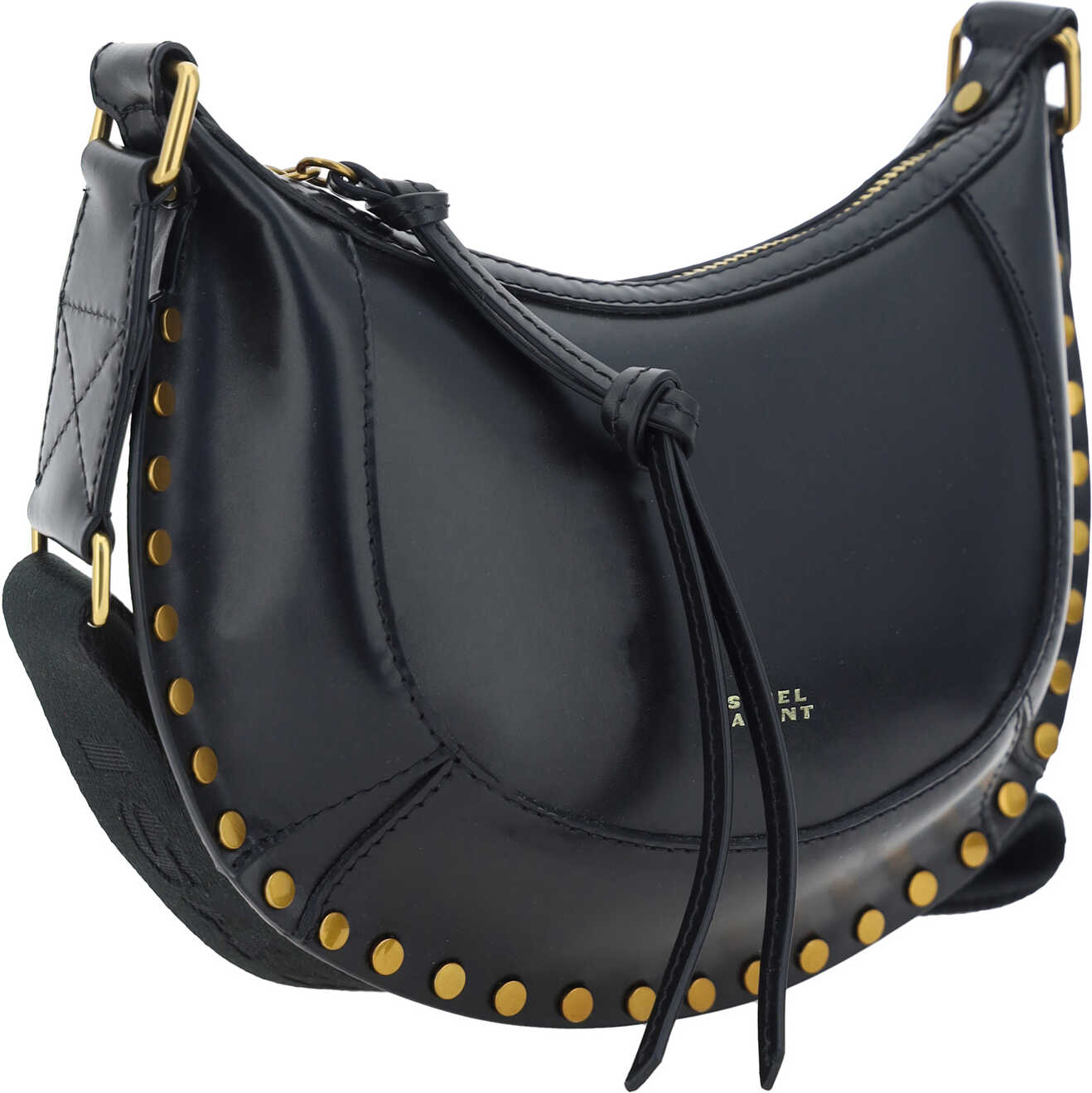 Calfskin Mini Moon Shoulder Bag by Isabel Marant featuring zipper closure at top, single adjustable fabric shoulder strap, single interior compartment, iconic brand monogram stamped on front, round bronze-plated studs applied to profile.