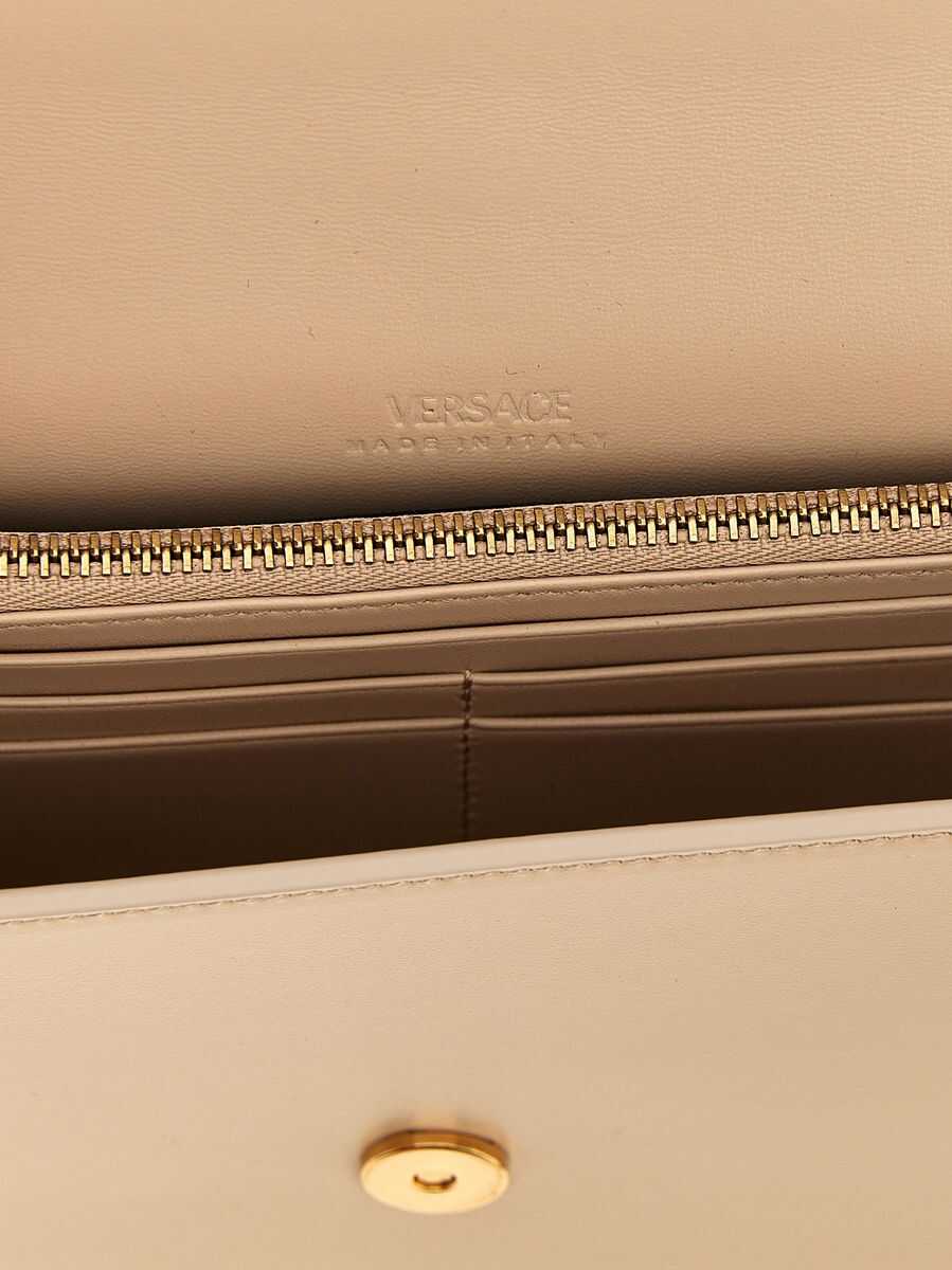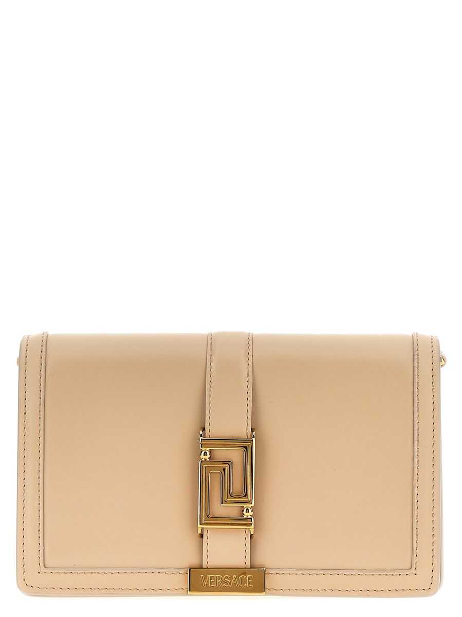 'Greca Goddess' leather clutch bag with snap button closure, metal elements with Greca, removable chain shoulder strap, compartment with zip closure