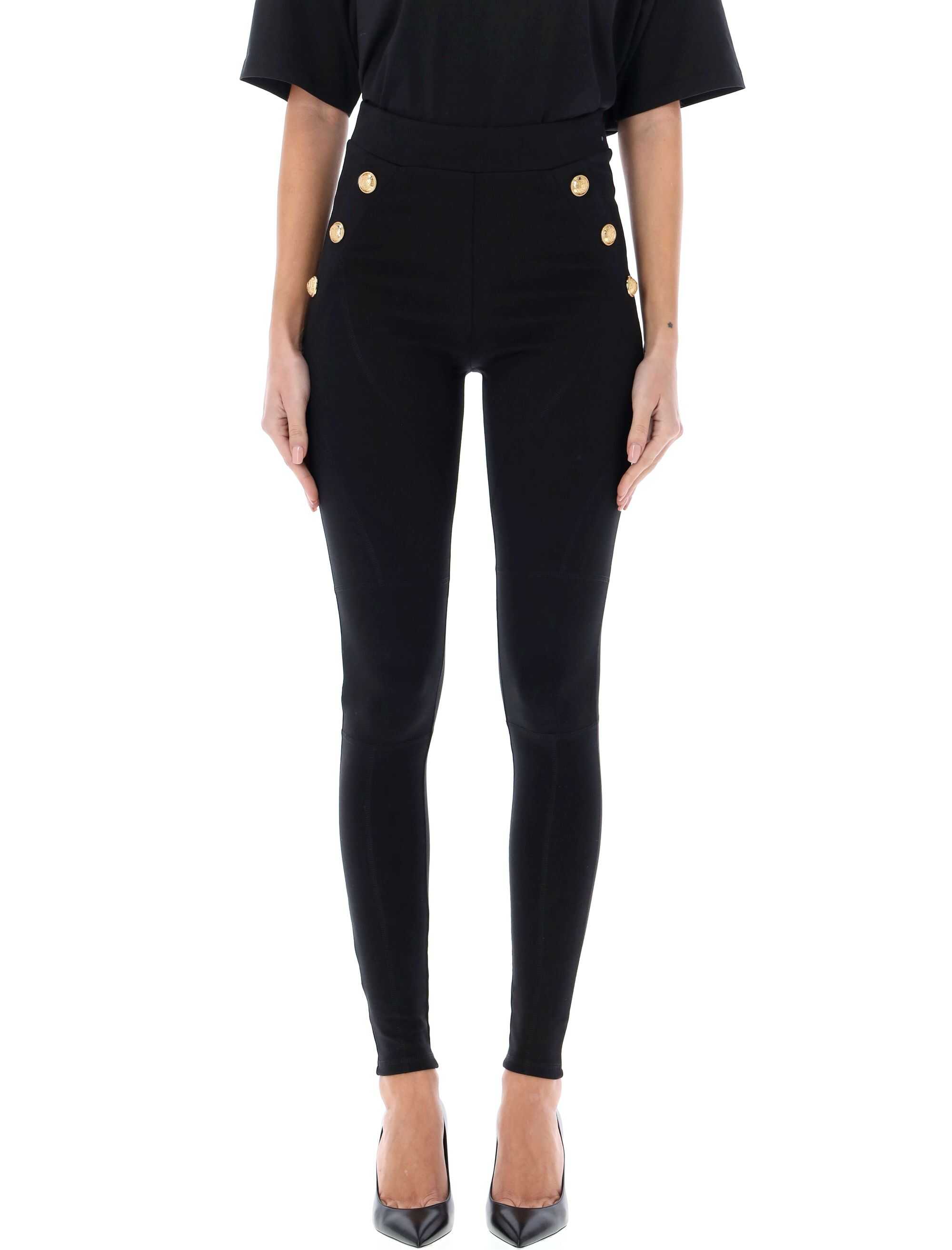 Elevate your style with these luxurious knit leggings from Balmain. The combination of cotton, modal, elastane, and polyamide ensures comfort and durability. Featuring an elasticated waistband and 6 decorative golden metal buttons, these leggings provide a tight fit and yoking-style topstitching. Perfect for a fashion-forward look. Model is 1.72 m and wears size S.