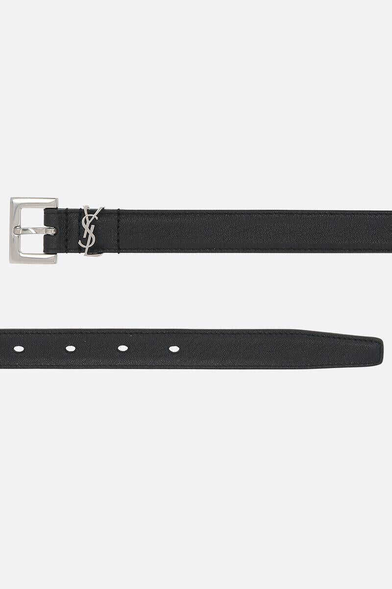 Saint Laurent's thin belt crafted in black nappa. Featuring adjustable closure with silver-tone metal squared buckle and interlocking YSL signature loop.
