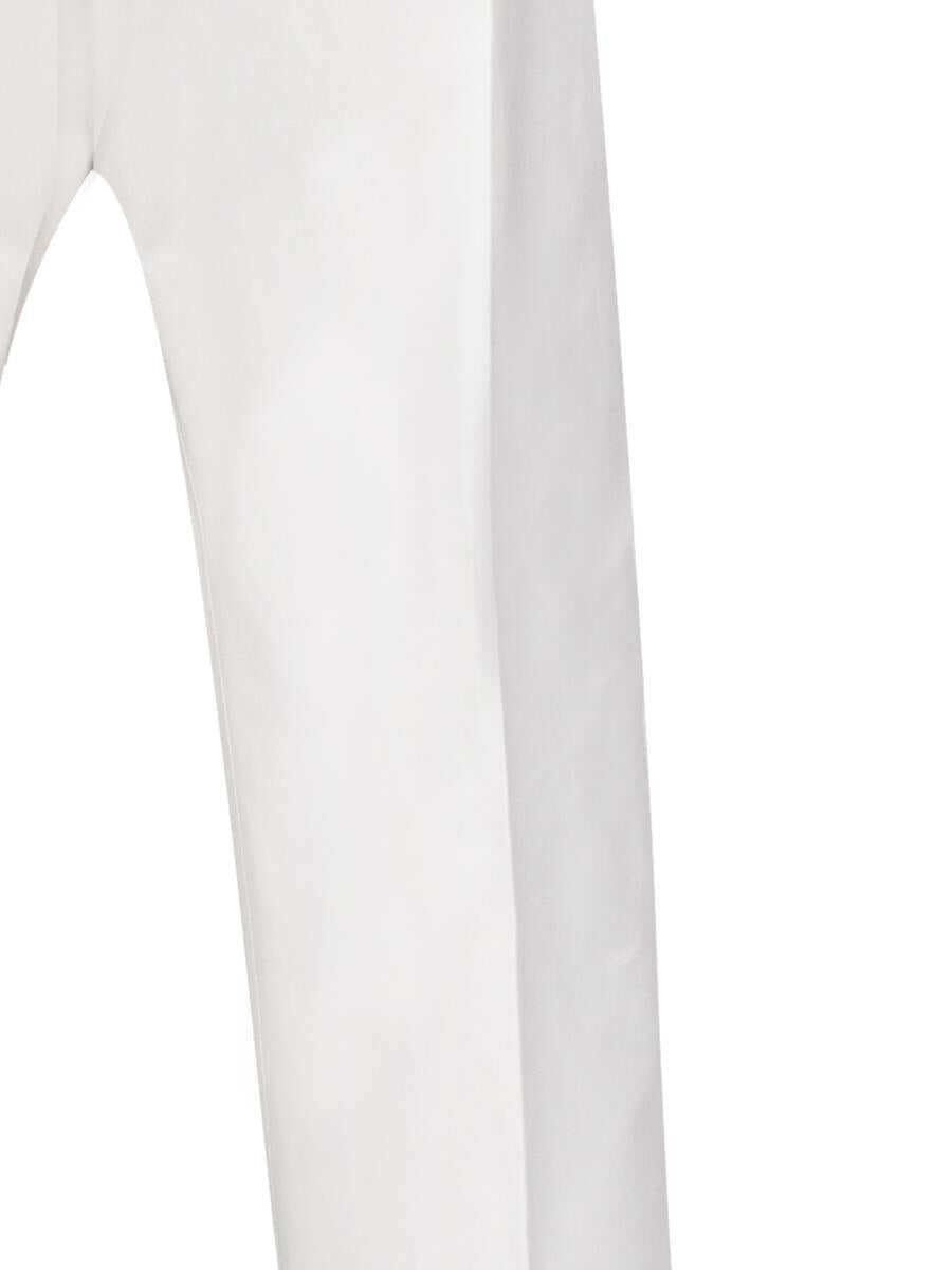 cream white cotton blend gabardine weave concealed front button, hook and zip fastening belt loops pleat detailing classic five pockets logo patch to the rear straight leg