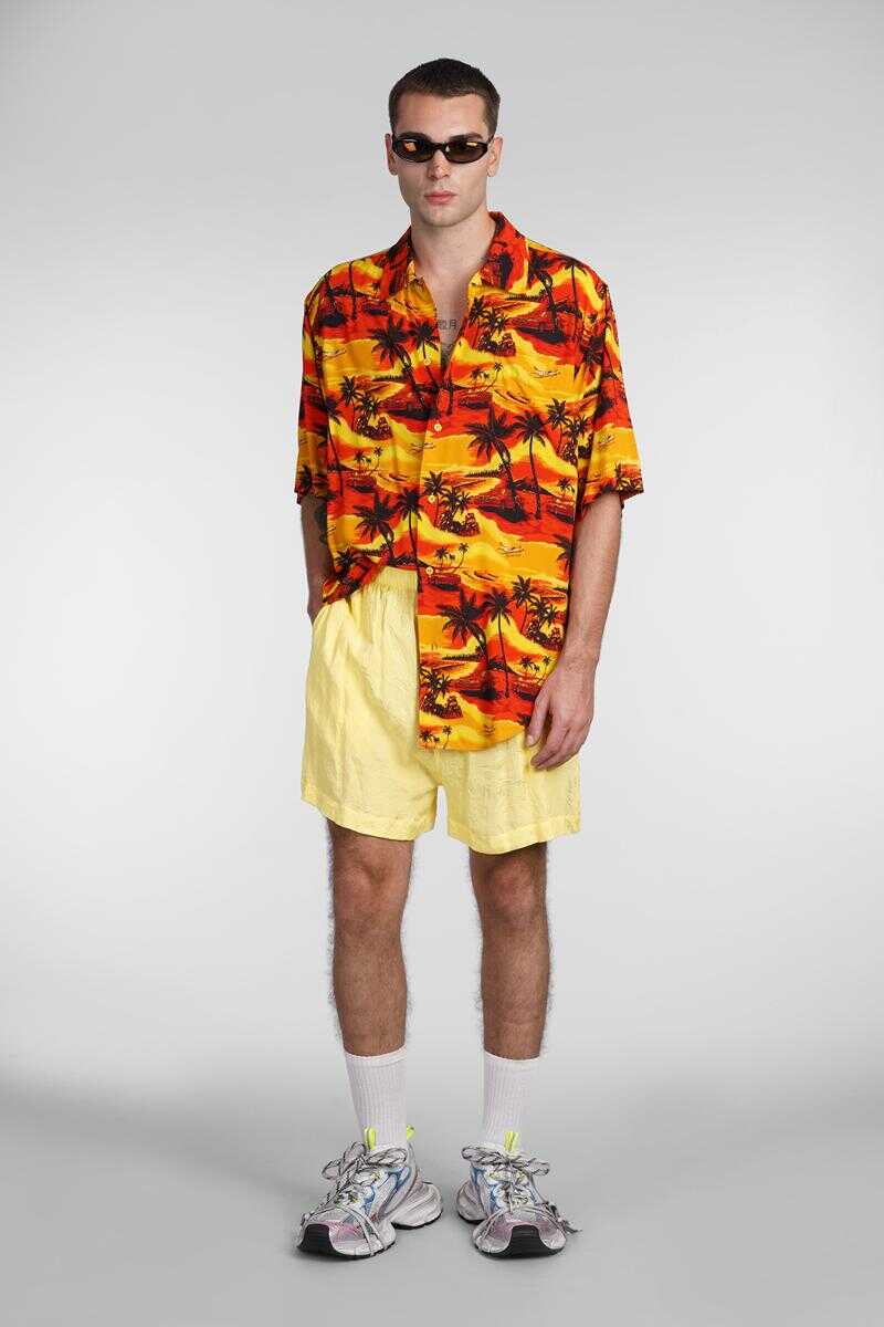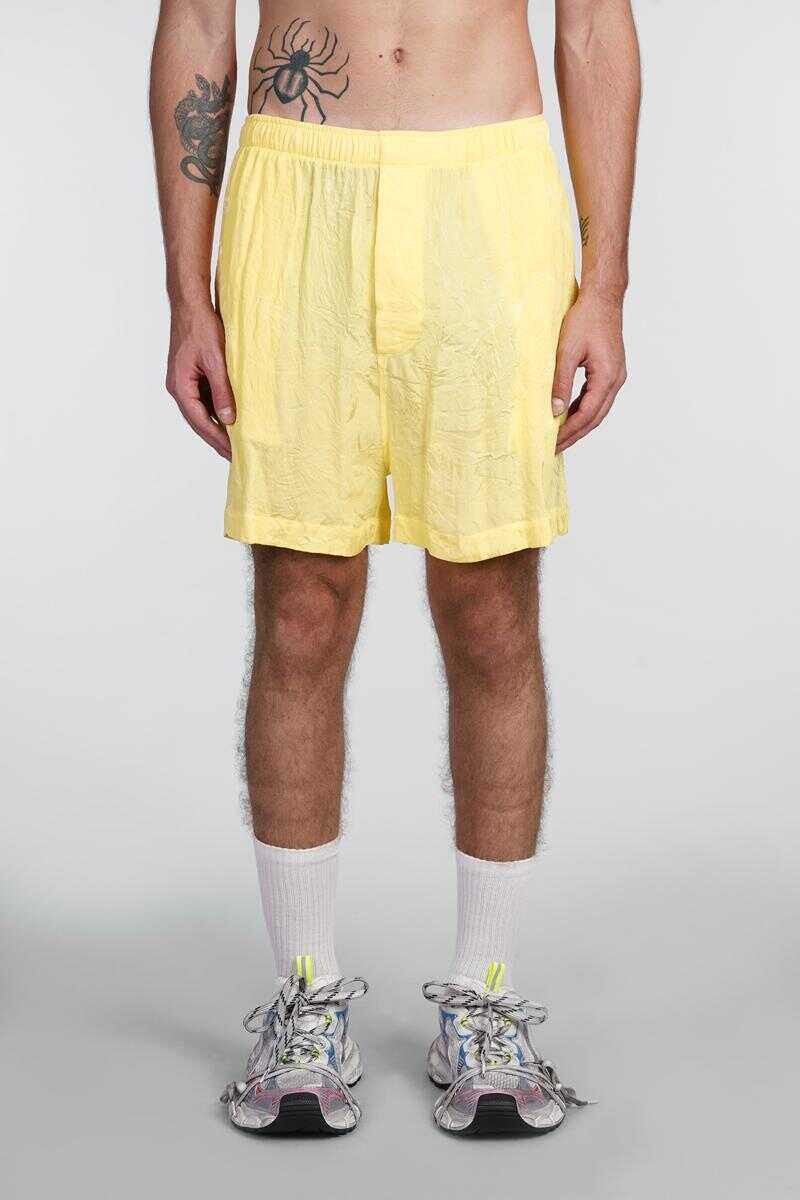 Shorts in yellow silk, waist elastic band, side pockets, jacquard lavoration, back pocket, back embroidered logo, 100% silk, Made in Italy
