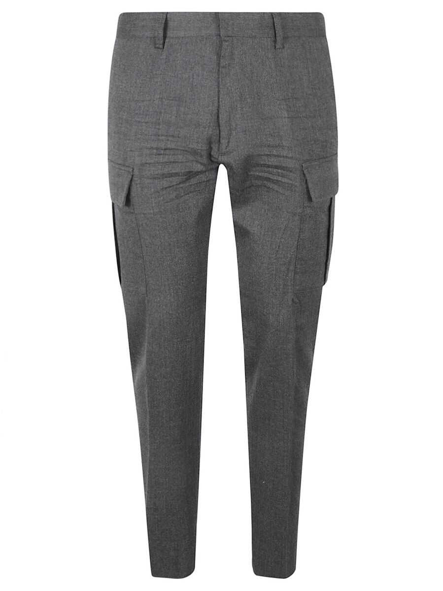 medium grey virgin wool blend mélange effect felted pressed crease belt loops concealed front zip fastening tapered leg two side slash pockets two side cargo pockets two rear button-fastening jetted pockets straight hem