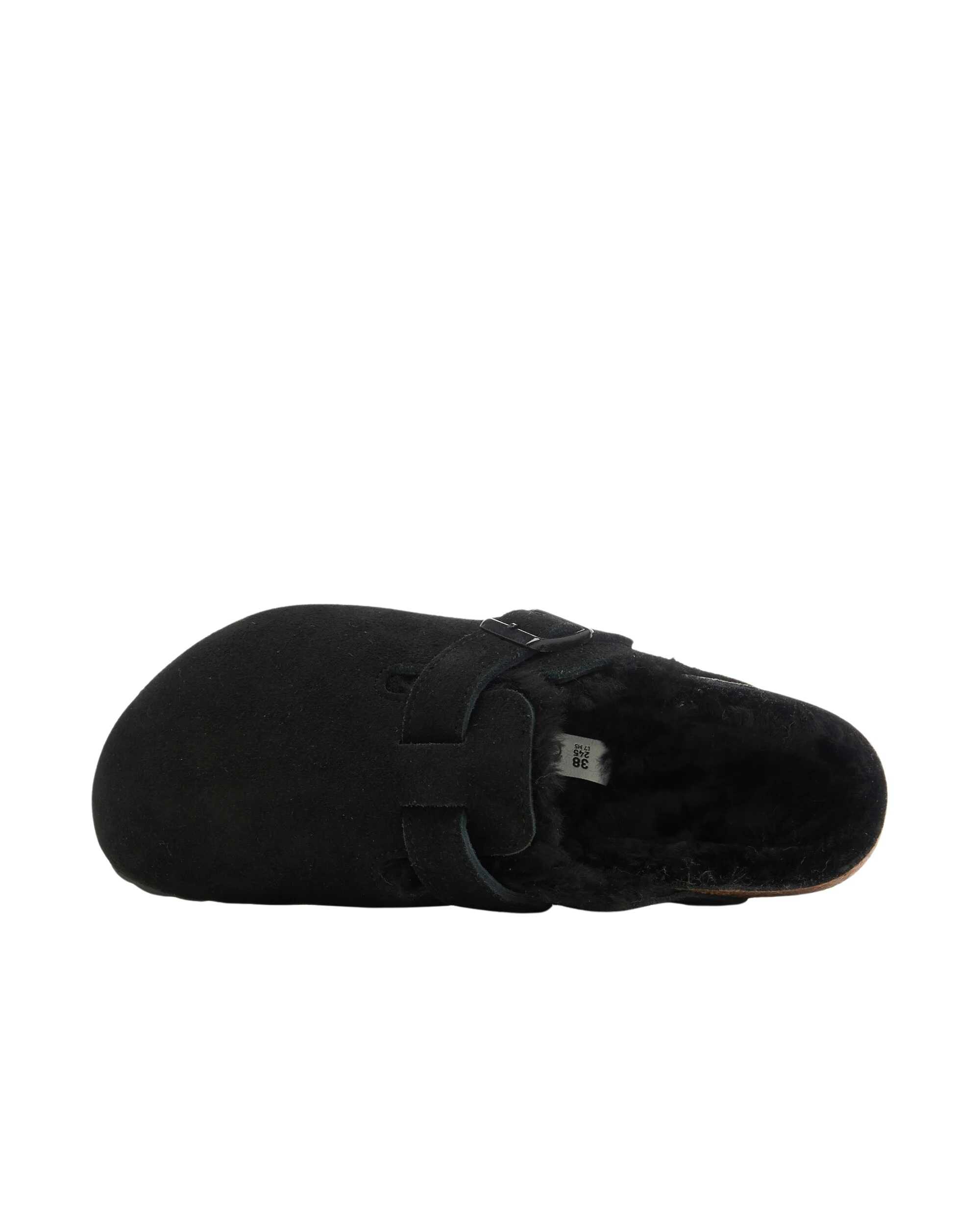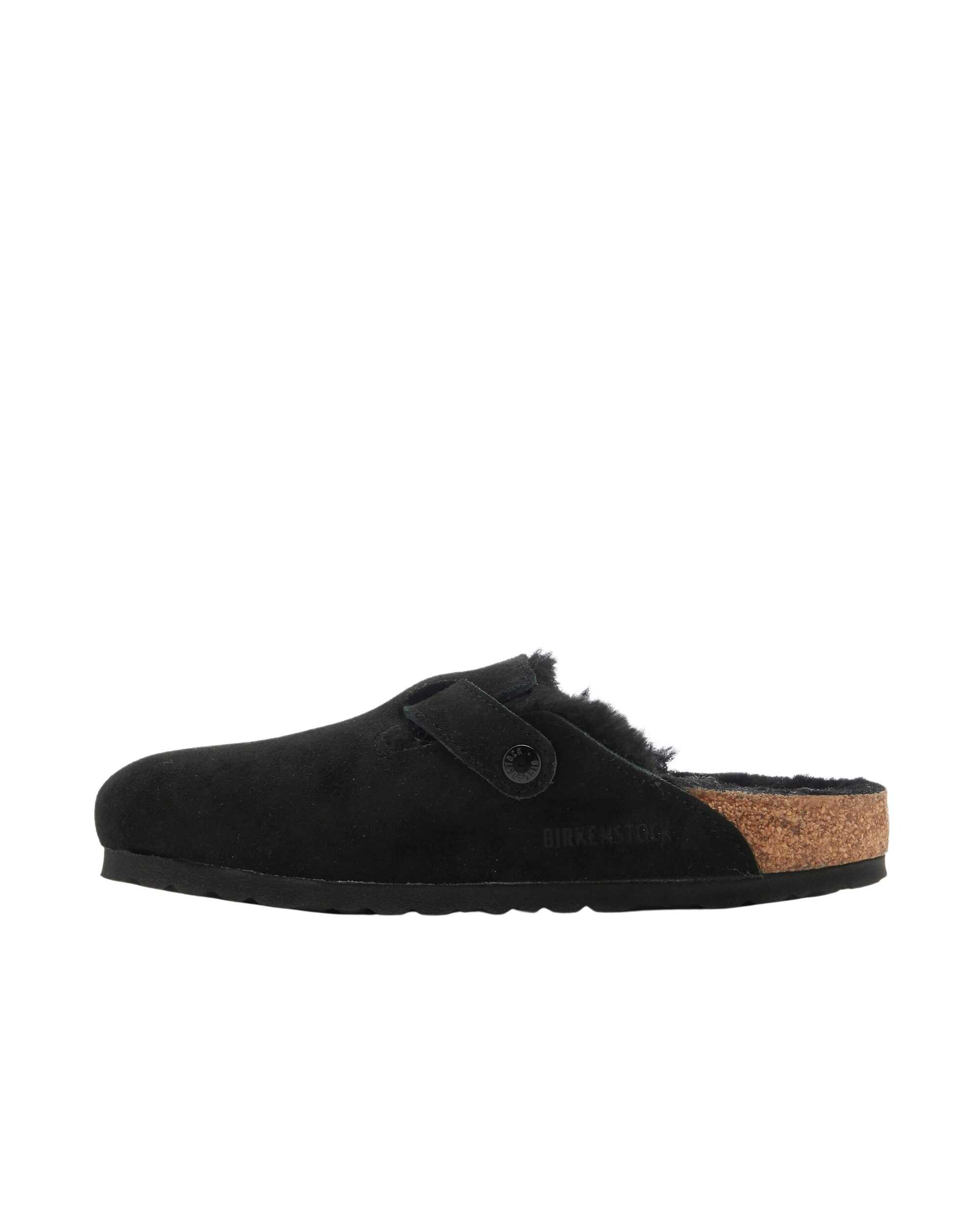 `Birkenstock footwear with an anatomical cork and latex footbed, suede leather upper with sheepskin lining, sheepskin insole, EVA sole, individually adjustable metal buckles.`