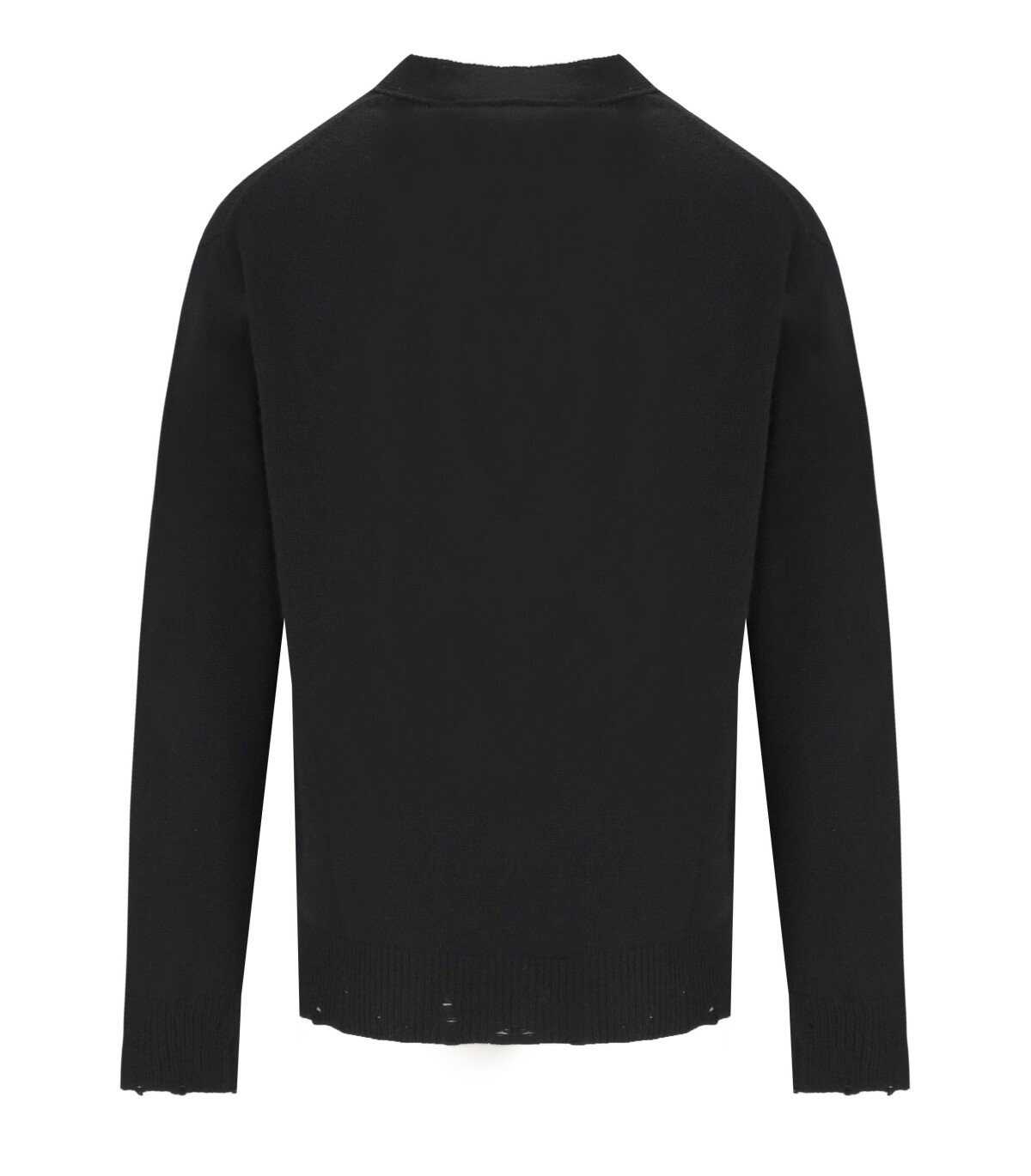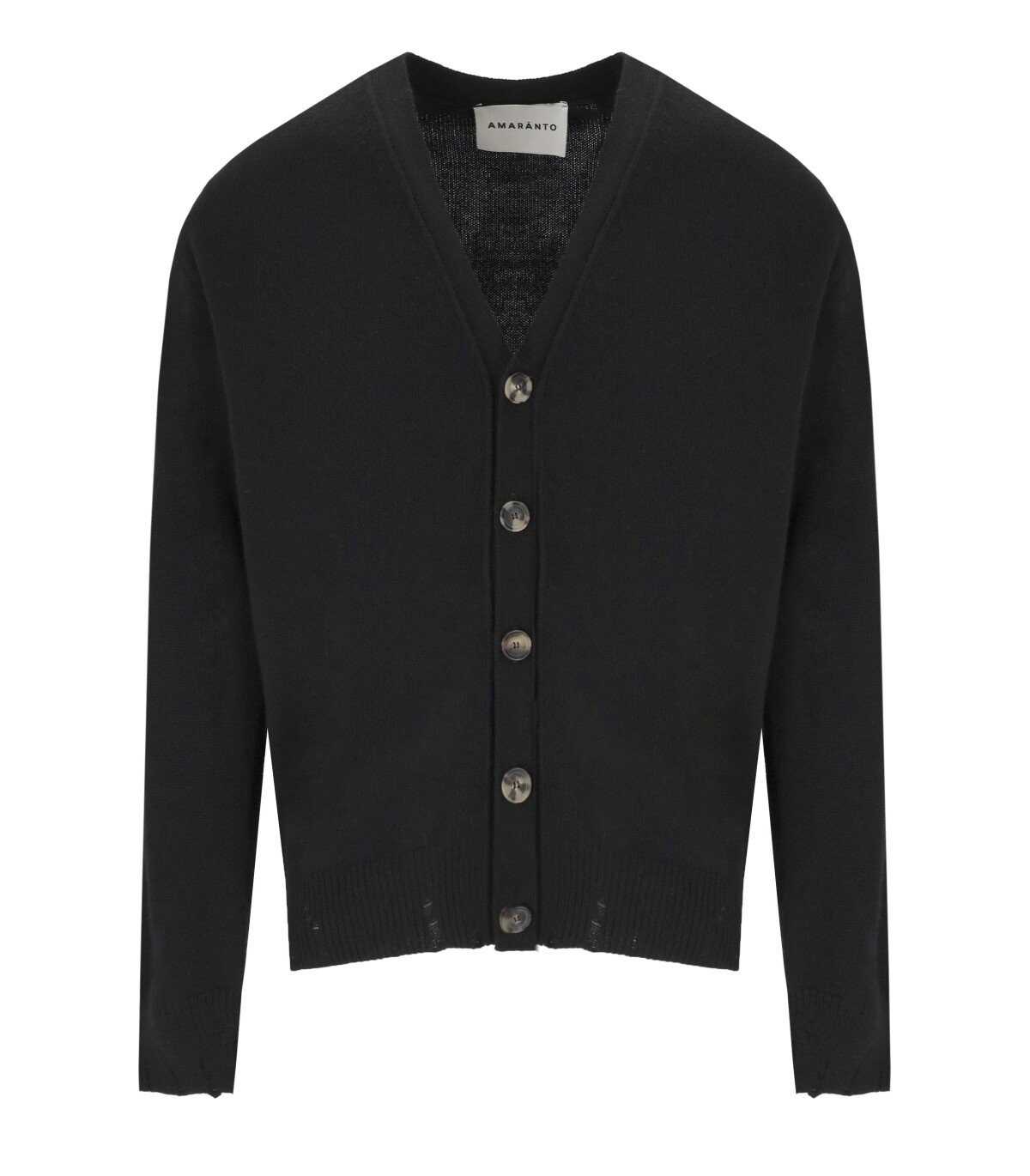 Amrànto cardigan made of a wool-cashmere blend fabric, in black. Characterized by a front button closure, it features soft long sleeves finished with ribbed cuffs. Equipped with a perforated hem and a spearpoint V-neck. Loose fit.