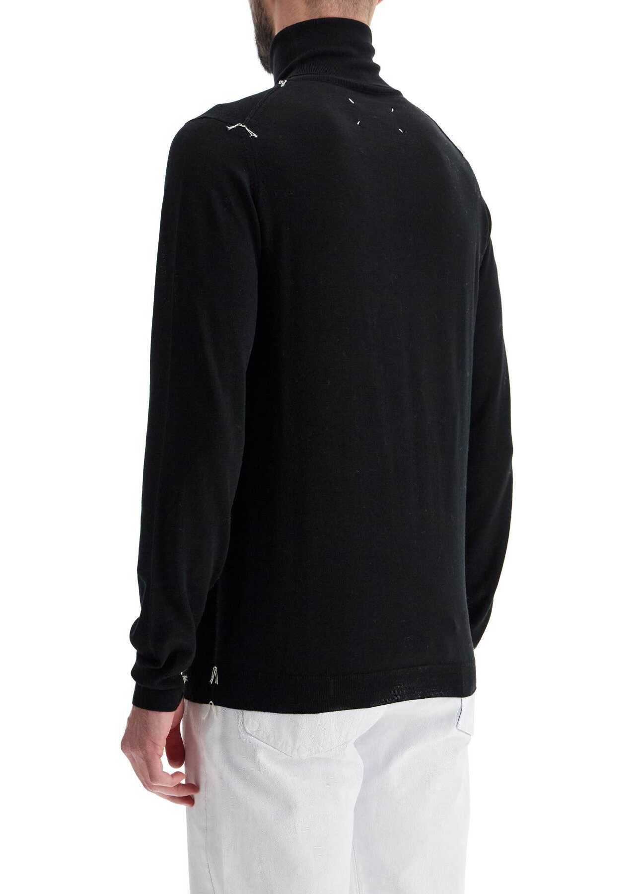 This Maison Margiela pullover is made of a thin ribbed knit in pure wool, enriched with contrasting Work in Progress stitching. It features a high collar, ribbed cuffs and hem, and boasts a regular fit. Signed with the characteristic four stitches behind the neck. The model is 185 cm tall and wears a size M.