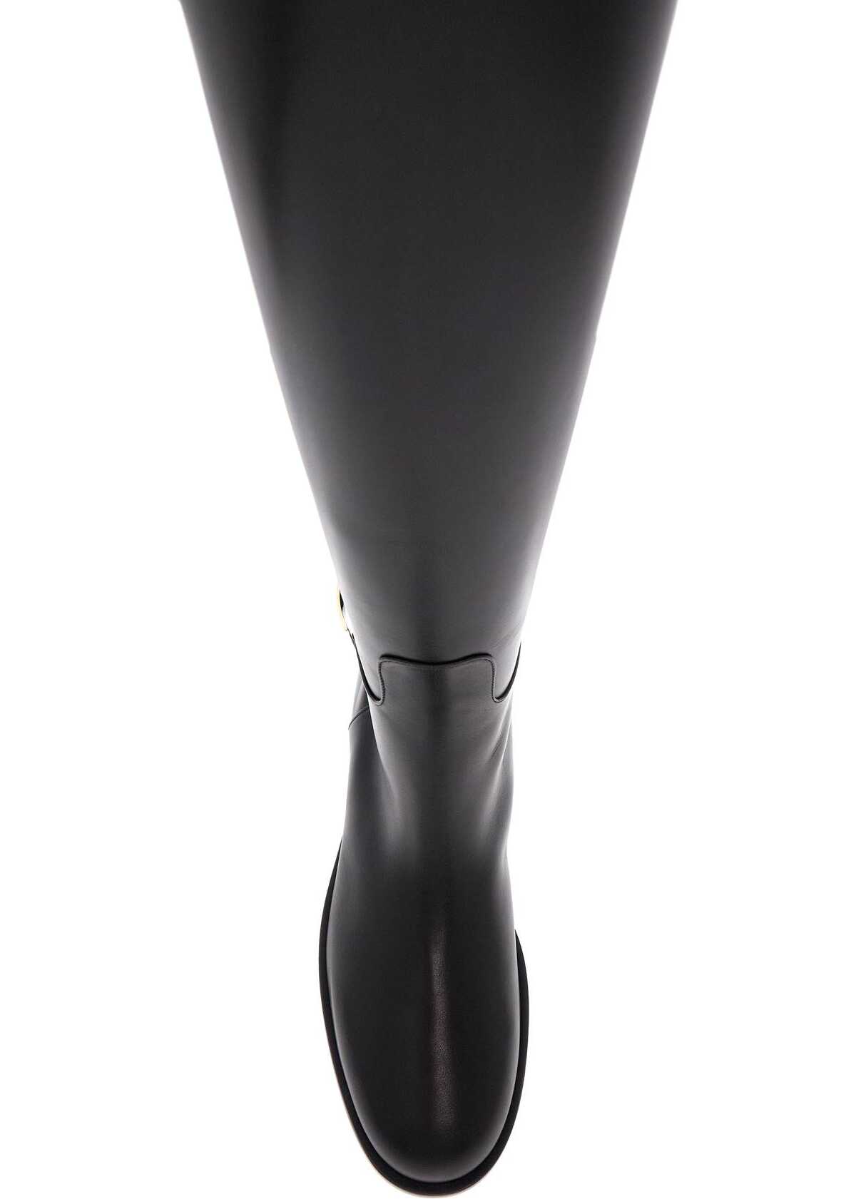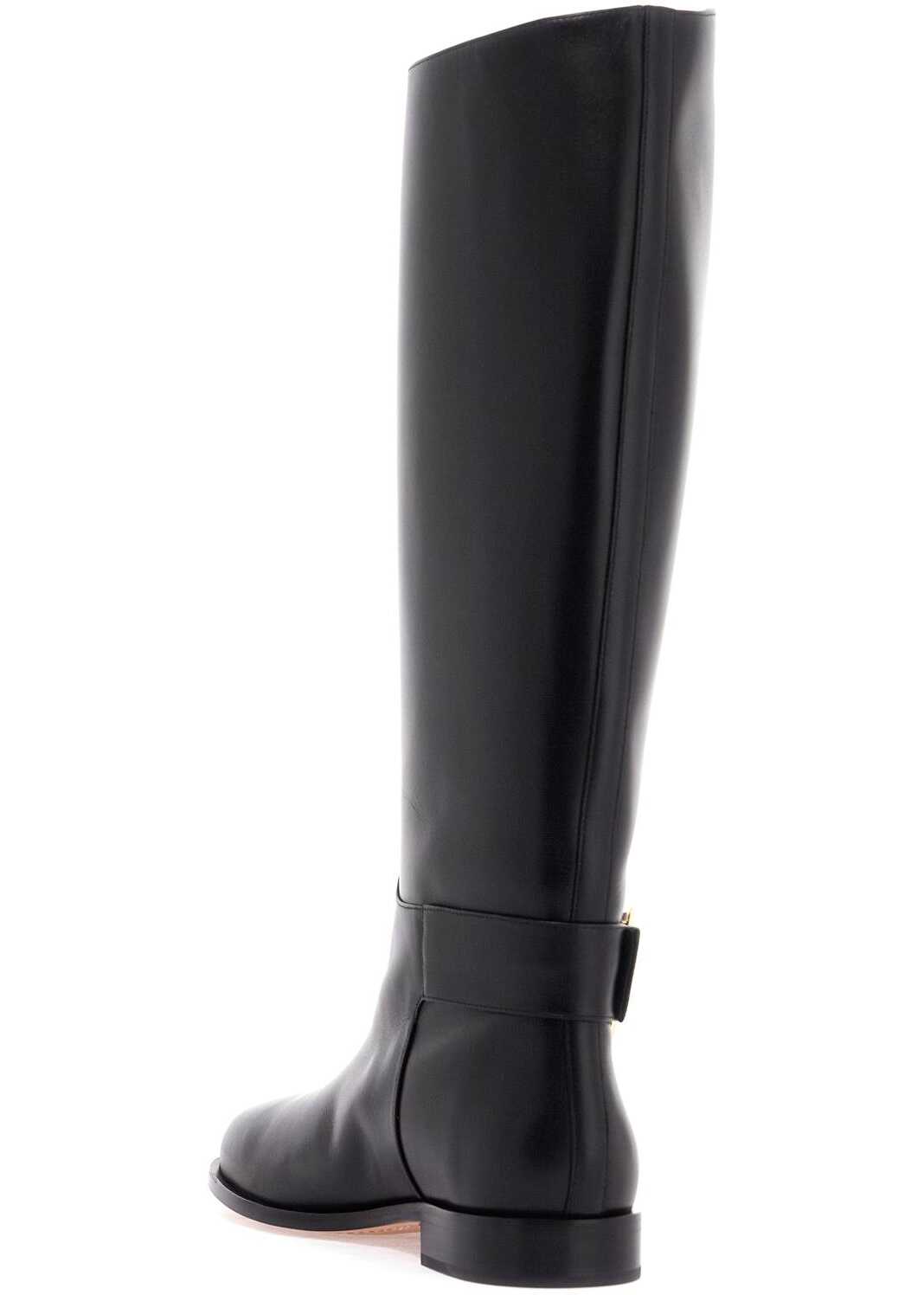 These Roger Vivier high boots are crafted in smooth leather and adorned with the iconic Très Vivier golden metal buckle. The design is sleek, featuring a leather lining and a leather sole. These knee-high riding boots are a must-have for any fashion-forward wardrobe.