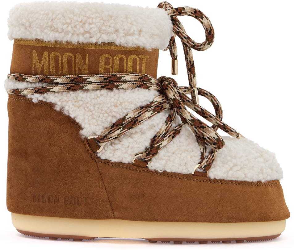The Moon Boot Icon après-ski boots are made of shearling with contrasting suede leather inserts and a laminated logo on the upper band. They feature criss-cross tubular laces and an adjustable drawstring, as well as a faux fur lining with insulating padding. The thermoplastic rubber midsole and non-slip rubber sole make them suitable for both left and right feet and various sizes.