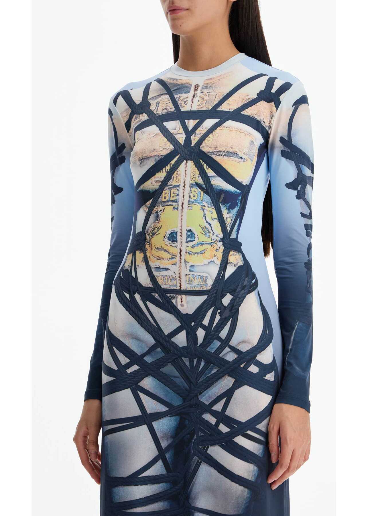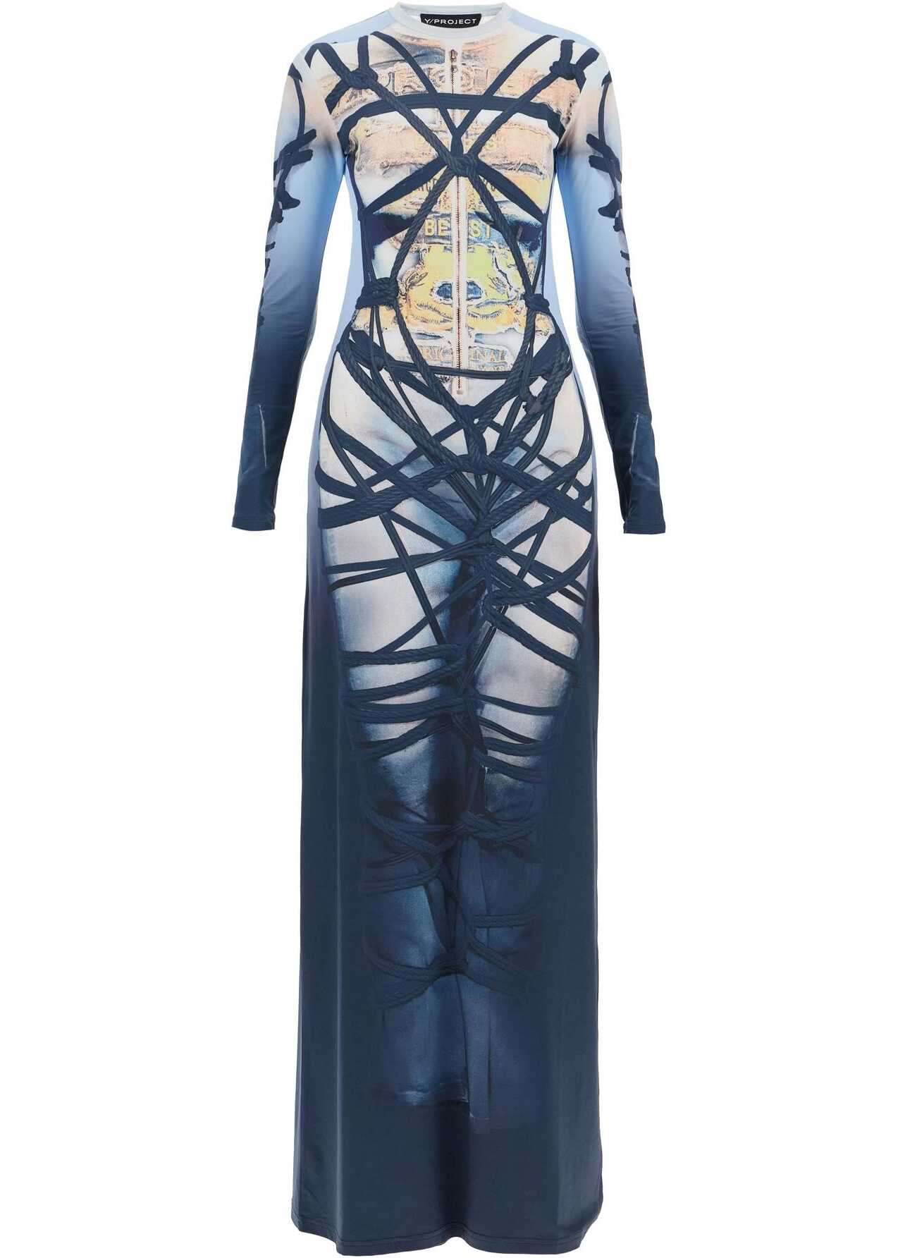 This long Y/Project dress is characterized by an all-over "Bondage" print. Made of lightweight stretch jersey, it has a fluid and fitted silhouette with long sleeves and a round neckline. The model is 177 cm tall and wears size S.