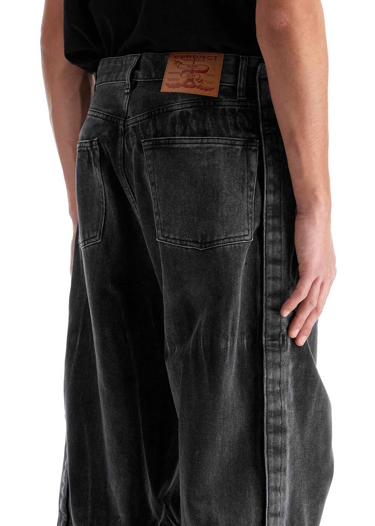 These Y/Project jeans are made of pure cotton denim with a dark vintage wash and feature a unique convertible design characterized by large removable front panels thanks to velcro tears. The five-pocket style has a baggy fit, zip closure on the side, belt loops, and a logo jacron on the back waistband. The model is 182 cm tall and wears a size 30.